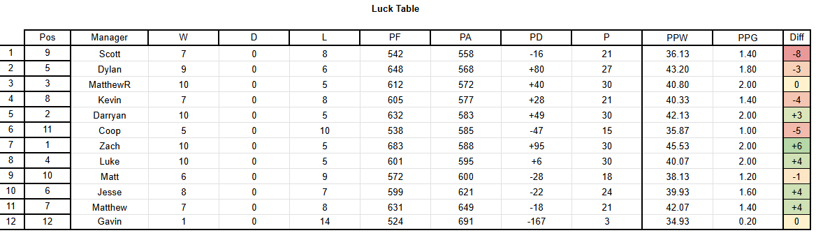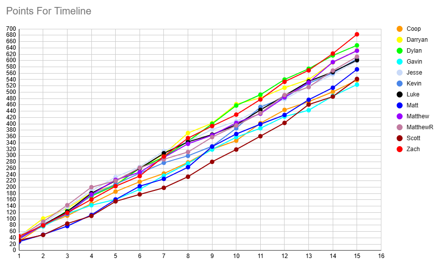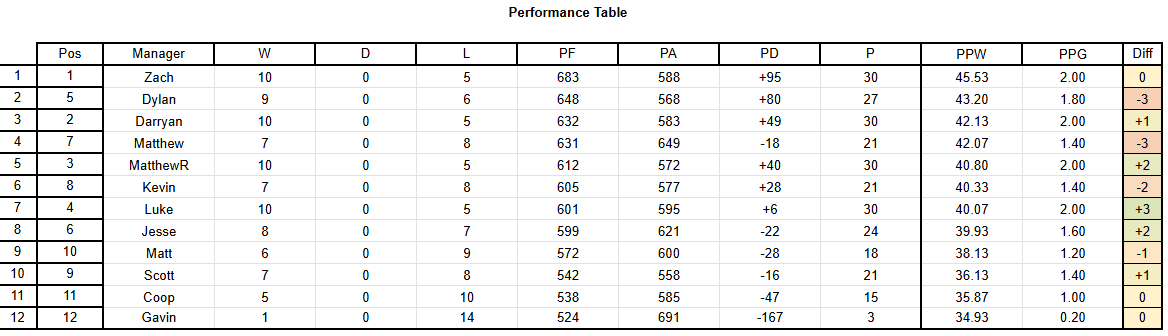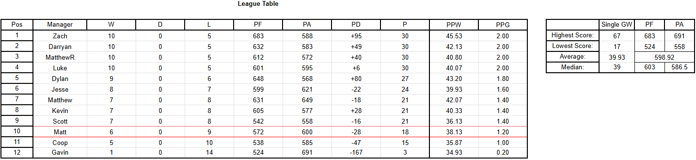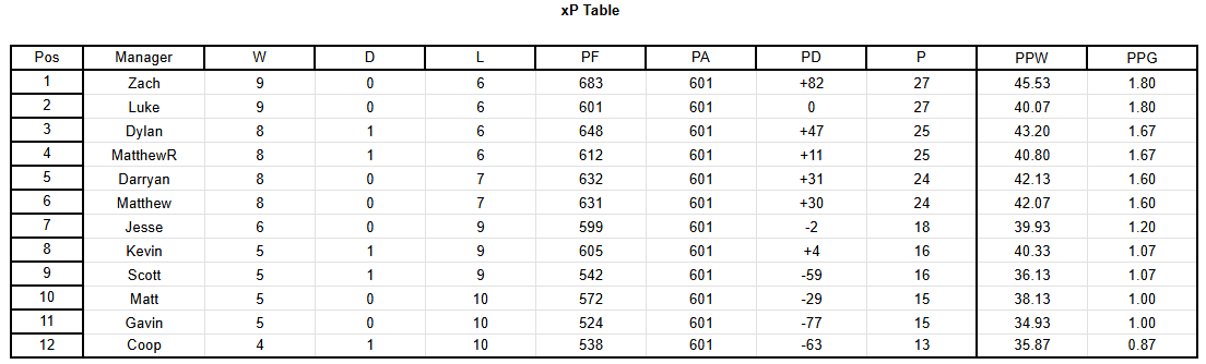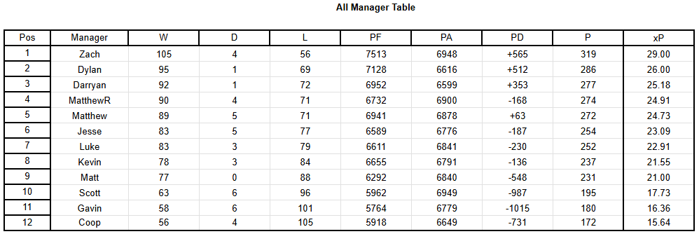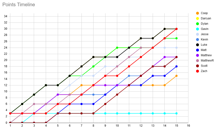 A huge week for the table as we see a 4 way tie for 1st on 30 points! Zach leads on PF, with Darryan, MatthewR, and Luke all battling it out as well. Dylan drops to 5th, just 3 points off this group and 3 points ahead of Jesse. Jesse himself is 3 points ahead of the group on 21, which is led by me. I am joined by Kevin and Scott. Matt sits 3 off us and Coop another 3 back!