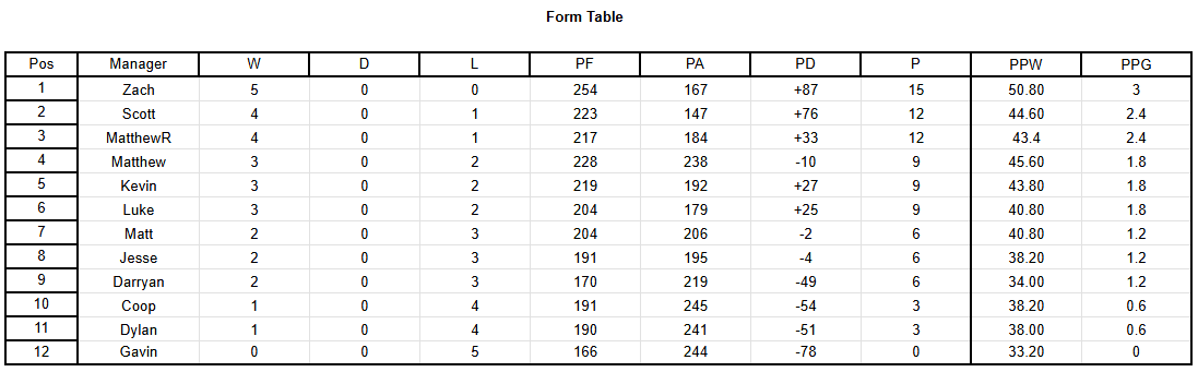 In terms of form, Zach sits on top of the table with 15/15 points earned! Scott and MatthewR sit just behind with 12!