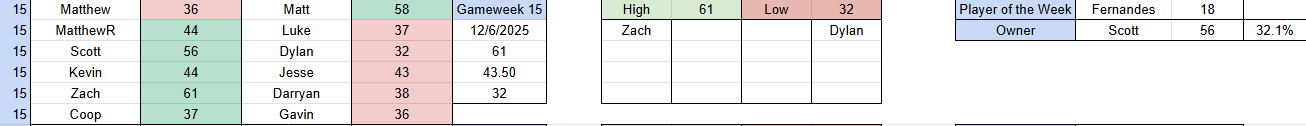 Hello everyone and welcome to gameweek 16! Waivers this week are due Friday morning at 5:30am PST / 8:30am EST! Highlights from this week include a wild win for Kevin over Jesse 44-43, Zach picking up a huge result against Darryan 61-38, and Coop narrowly stealing 3 points from Gavin by a score of 37-36. Full results are as follows: