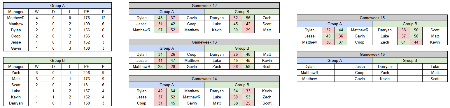 Hello everyone and welcome to week 5 and the final week of the Group Stage in the Boxing Day Bash! Some interesting results across the two groups, headlined by the nailbiter in Group A where Coop beat me 37-36. Jesse also picked up his first 3 points with a 43-36 victory over Gavin! Across the stage in Group B, the biggest result sees Scott pick up a win against Darryan 56-38! Full results are as follows: