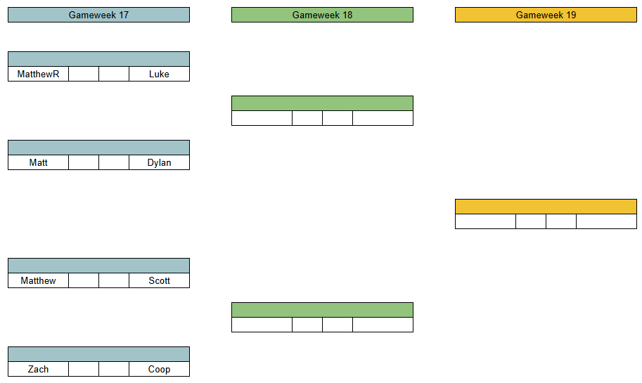 This week will see some great matchups, headlined by a huge matchup at the top between Luke and Zach! Elsewhere, MatthewR looks to fend off Scott and Darryan goes up against me! Full matchups are as follows: