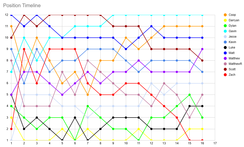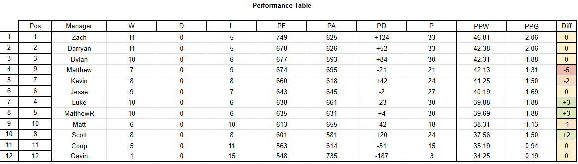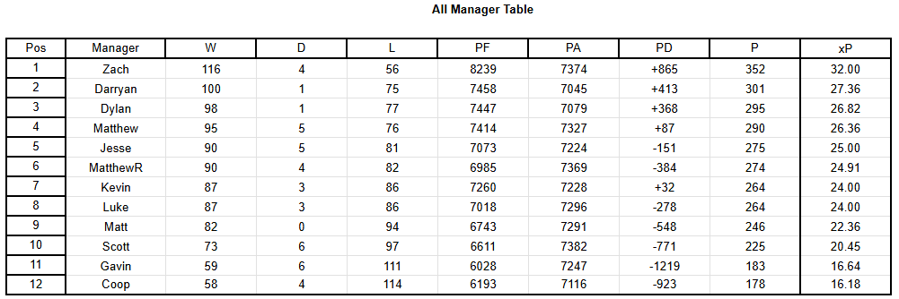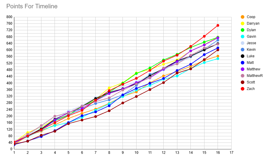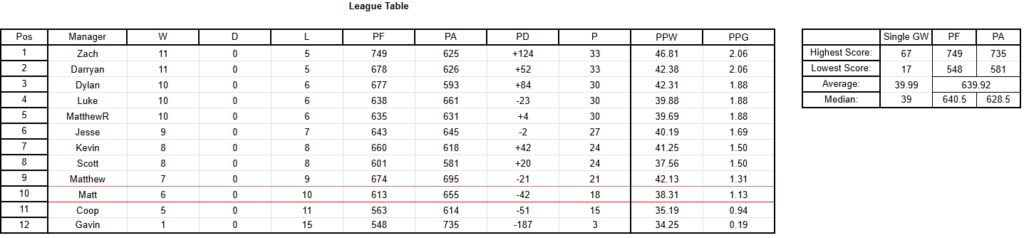 Taking a look over at the table, Zach and Darryan keep their spots at the top as their wins propel them up to 33 points, ahead of Dylan, Luke, and MatthewR, who all sit on 30. Jesse sits just 3 behind them, with Kevin and Scott leapfrogging me to move to 24 points.