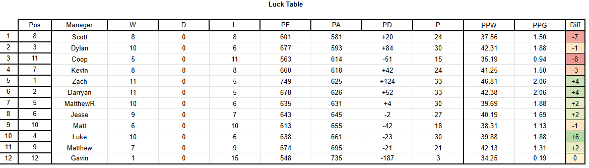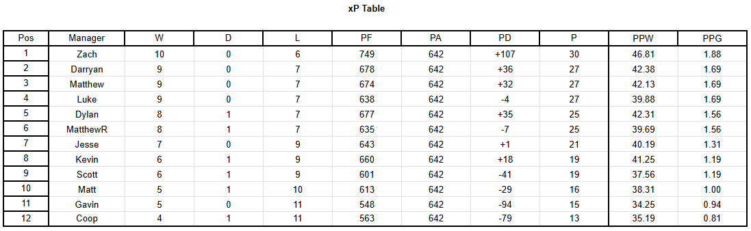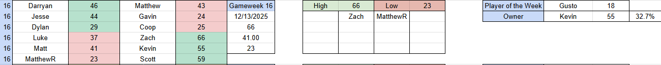 Hello everyone and welcome to gameweek 17! Waivers this week are due Friday at 3am PST / 6am EST as we have a full day of games on Saturday! Highlights from this week include the tragic 4th 3-point or fewer loss for me, 43-46 against Darryan, Dylan taking a narrow 29-25 victory over Coop, and Scott’s big 59-23 upset over MatthewR! Full results are as follows: