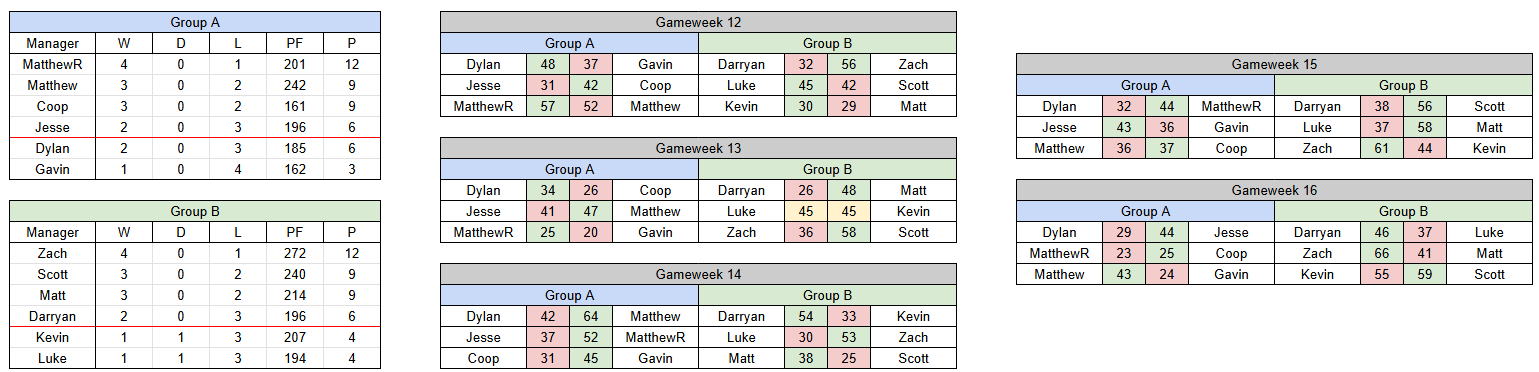 Hello everyone and welcome to the knockout stage of the Boxing Day Bash! Yes, that means the group stage has concluded and our final 3 weeks are upon us! Some interesting results across the two groups, most notably being the huge 59-55 Scott win against Kevin in Group B, which secured Darryan's place in the playoffs! Jesse also picked up a key win 44-29 against Dylan, and Coop secured his spot in the knockouts with a 25-23 win over MatthewR. Full results are as follows:
