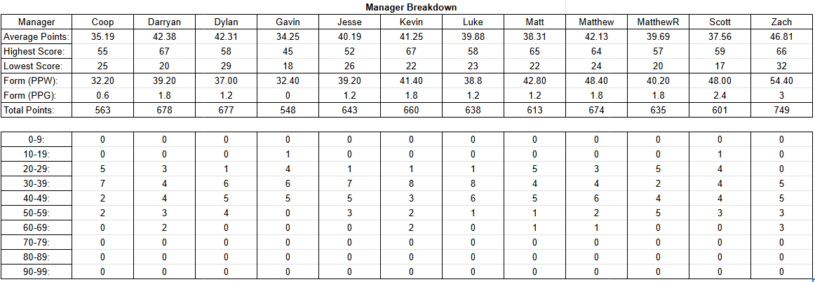In terms of form, unsurprisingly Zach leads that too with 15/15 points earned in the last 5! Scott is the lone manager on 12/15!