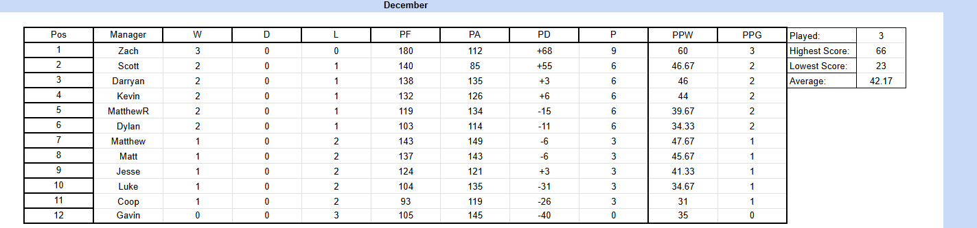 Halfway through December and Zach is the only undefeated manager! He sits just ahead of a slew of managers on 6 points, led by Scott, Darryan, and Kevin!