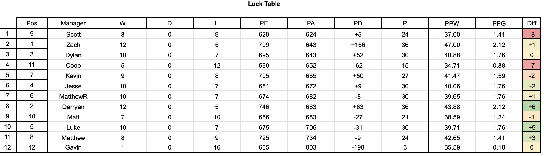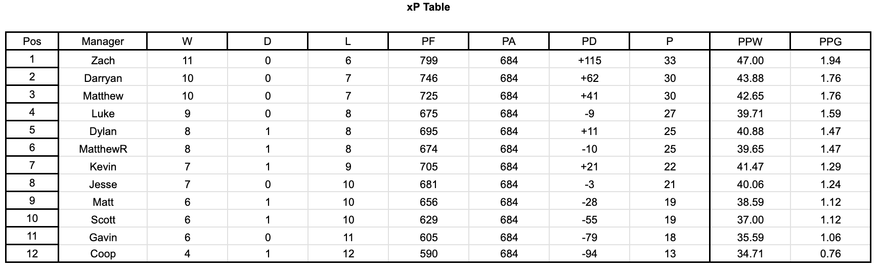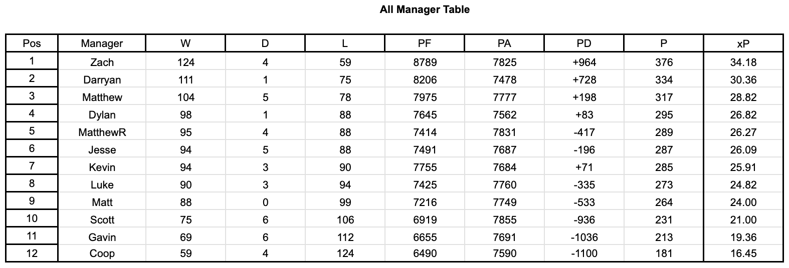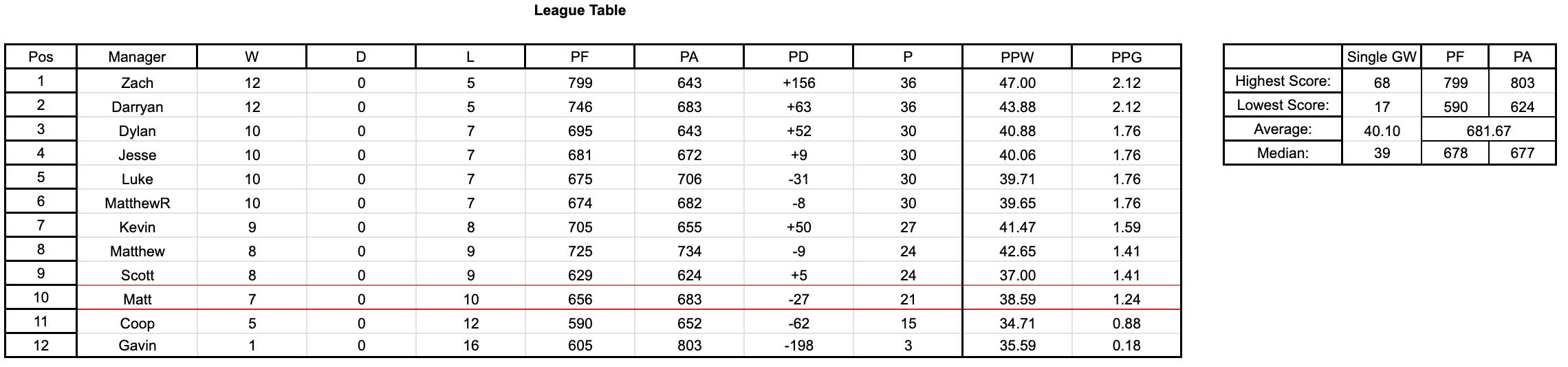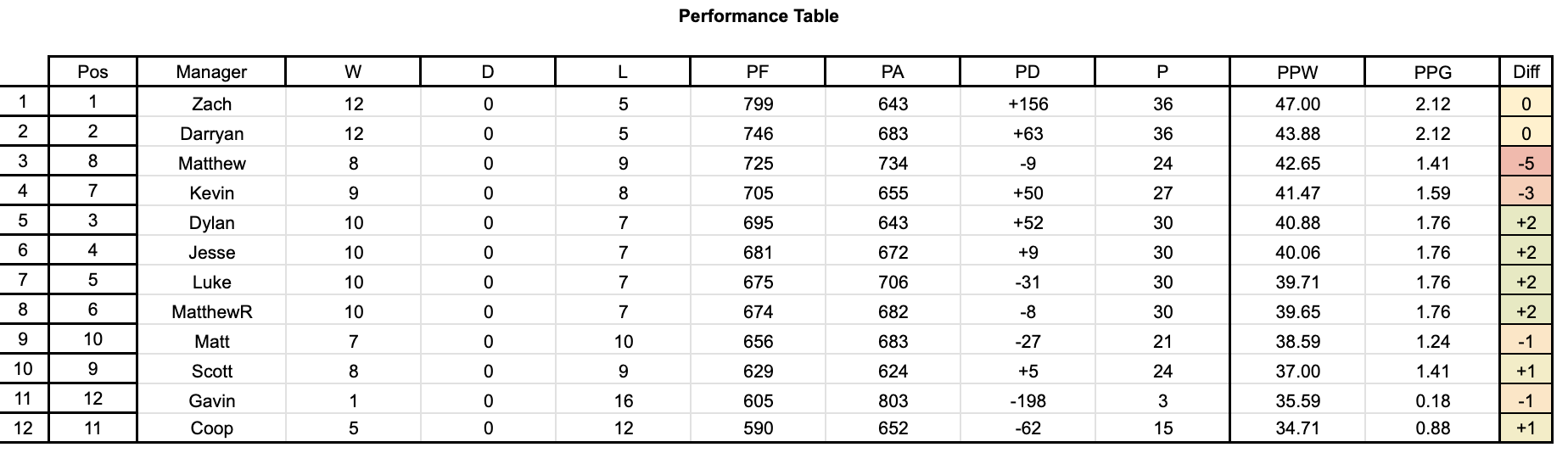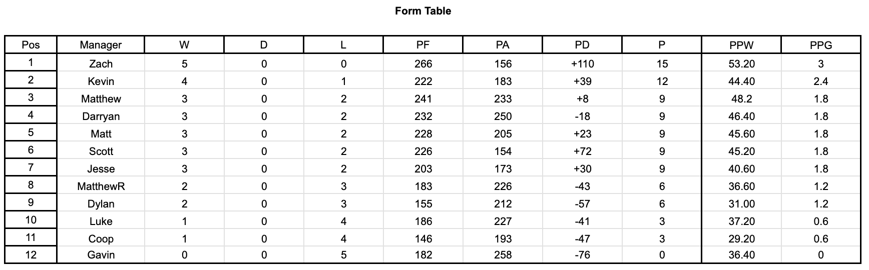 In terms of form, Zach of course sits on top of the table with 15/15 points earned! Kevin is the lone manager with 12 points earned in the last 5 weeks!