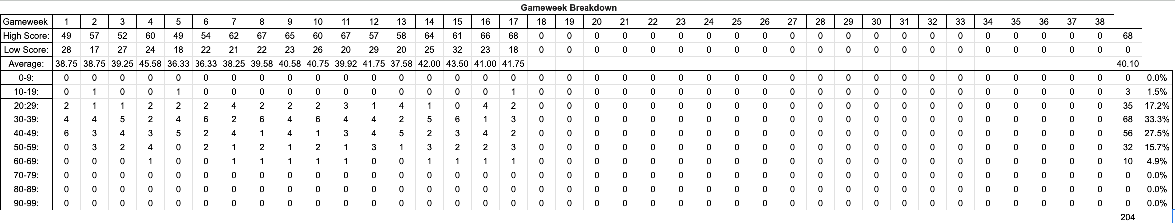 10 - Matt (NEW) - League A - Welcome to the list Matt! 5 solid weeks in a row (a low of 38) off the back of solid performances from Cunha, Bruno G, and the Manchester City defenders. Bowen also seems to be one of the few forward picks who are worth a spot on the team, so he has that going for him as well.