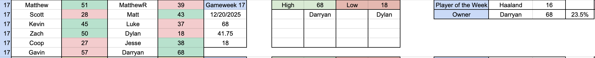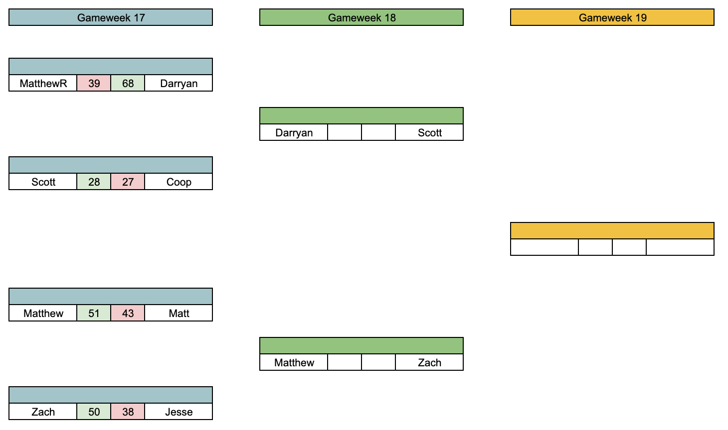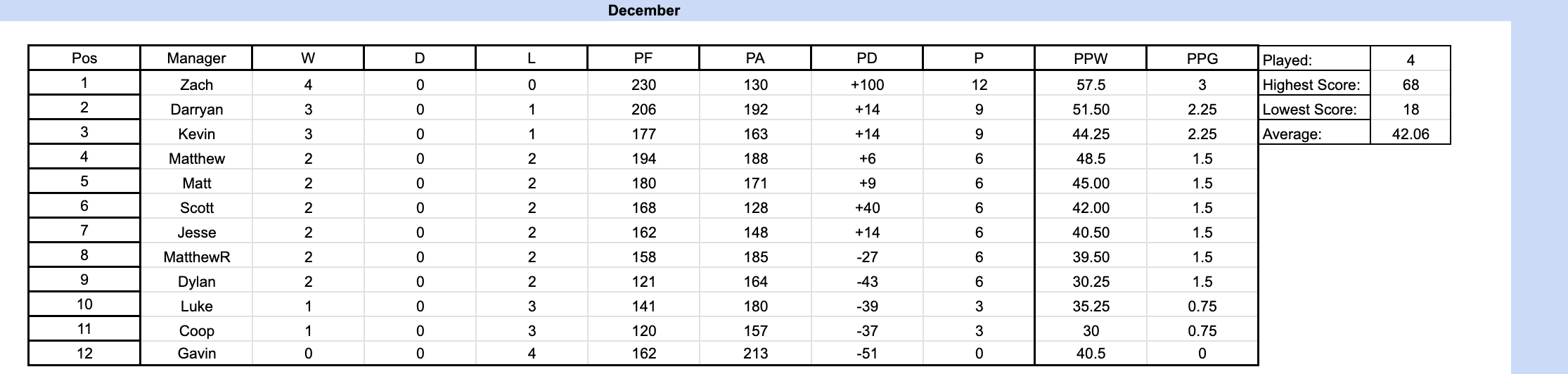 Hello everyone, happy holidays and welcome to gameweek 18! Waivers this week are due Thursday at 10:30am PST / 1:30pm EST! Highlights from this week include a crazy 68-57 match between Gavin and Darryan where unfortunately the former fell just short in pulling off the upset! Elsewhere, Kevin upset Luke's usual score 45-37, Matt picked up 3 points against Scott 43-28, and I defeated the other Matthew 51-39. Full results are as follows: