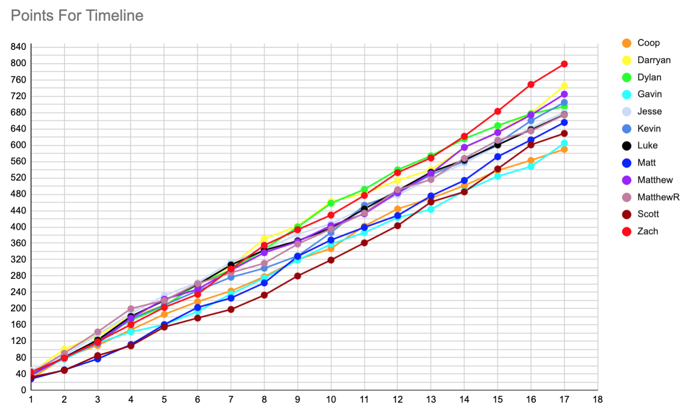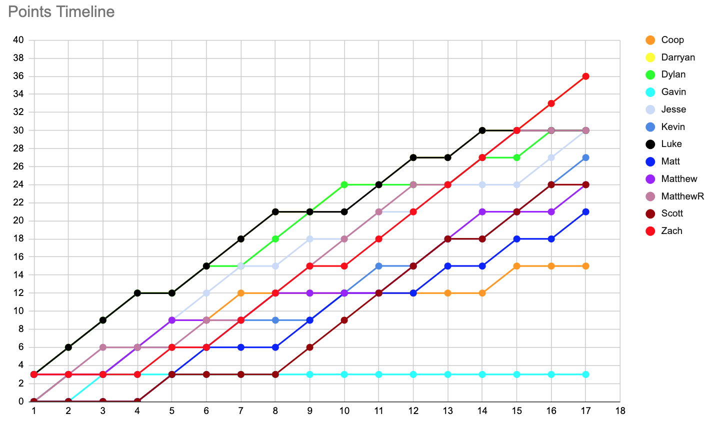 Heading over to the table, Zach and Darryan keep pace with one another at the top, extending their lead over 3rd to 6 points. And that group on 30 points consists of 4 managers: Dylan, Jesse, Luke, and MatthewR. Kevin's win brings him just 3 behind the pack, with my win taking me above Scott on PF just 3 points behind Kevin. Matt keeps himself within striking distance just 3 points behind us.