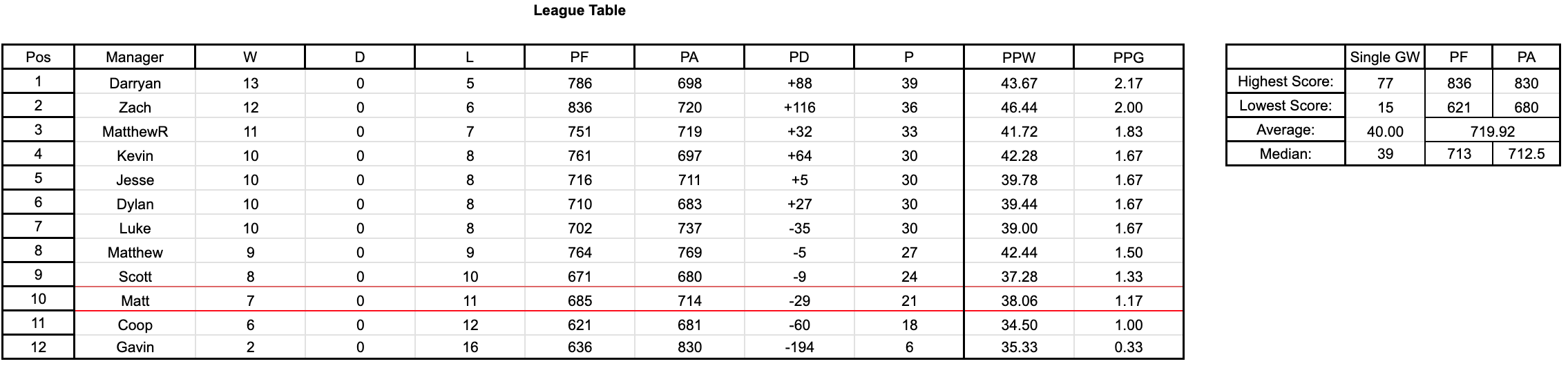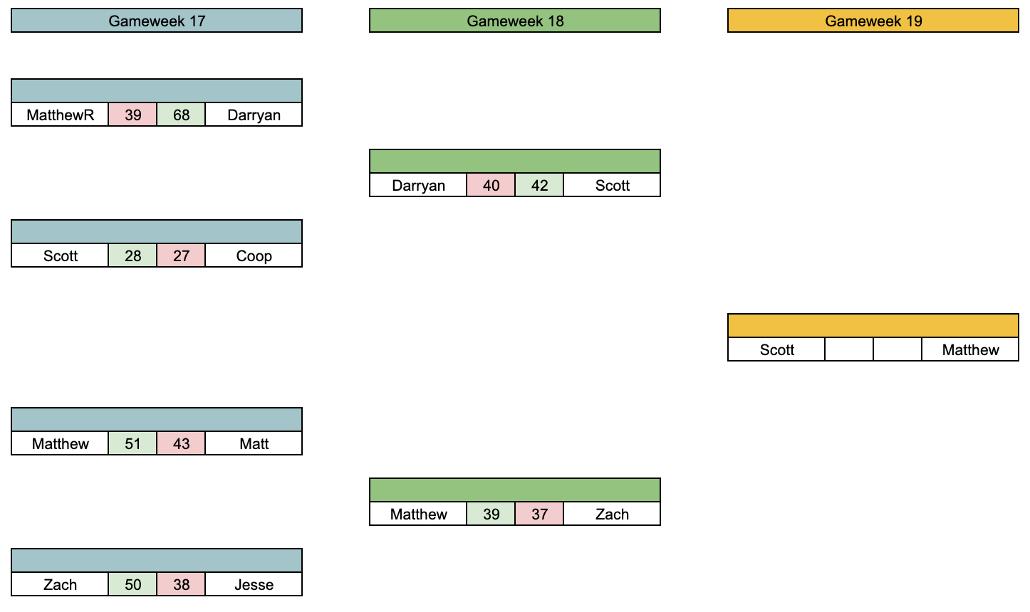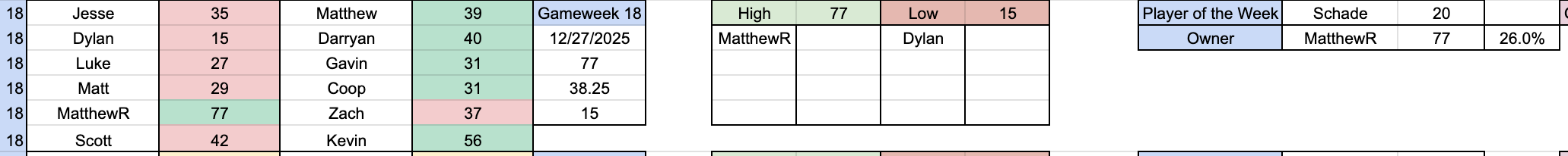 Hello everyone and welcome to gameweek 19! Waivers this week were due this morning (probably, I'm currently writing this on an airplane so I honestly am not sure when this will be sent out) since there are games tomorrow! Highlights from this week include a narrow 31-29 win by Coop over Matt, a high scoring 56-42 win by Kevin over Scott, a new high of 77 points from MatthewR against Zach's 37, and Gavin's 2nd win of the season: a 31-27 victory over Luke! Full results are as follows: