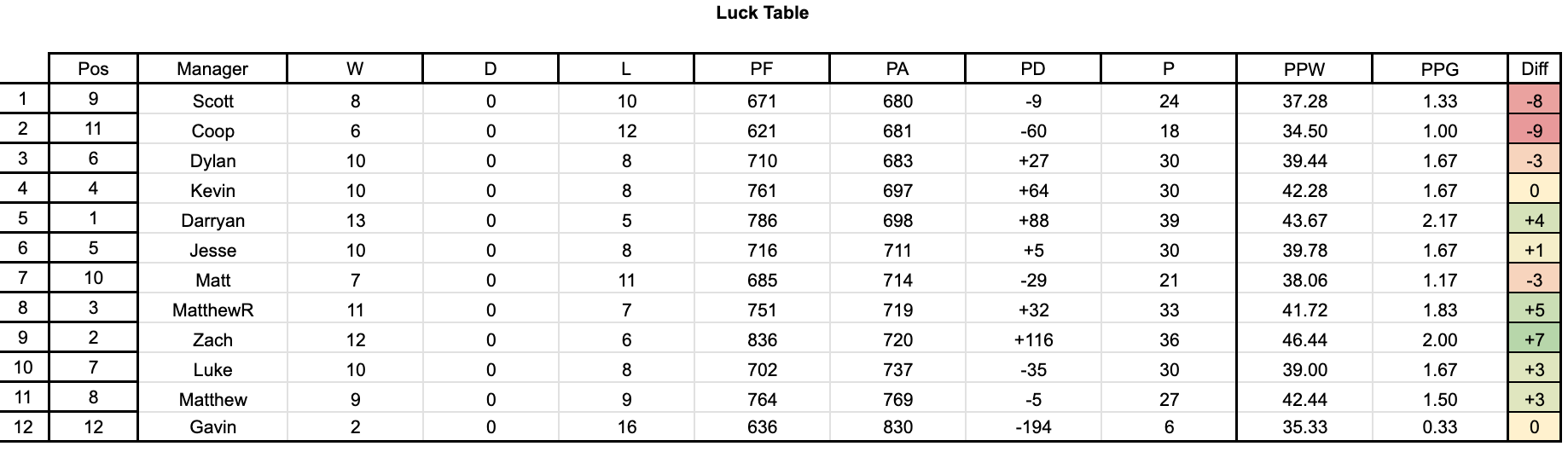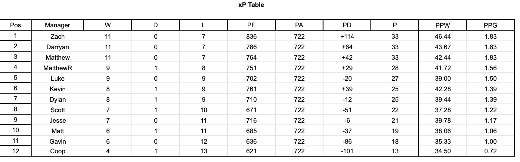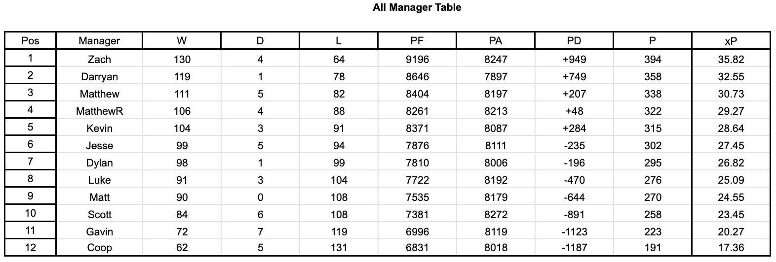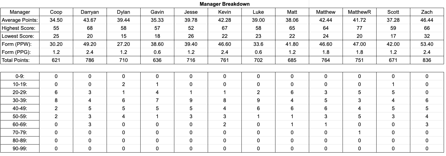 Hello everyone and welcome to gameweek 19! Waivers this week were due this morning (probably, I'm currently writing this on an airplane so I honestly am not sure when this will be sent out) since there are games tomorrow! Highlights from this week include a narrow 31-29 win by Coop over Matt, a high scoring 56-42 win by Kevin over Scott, a new high of 77 points from MatthewR against Zach's 37, and Gavin's 2nd win of the season: a 31-27 victory over Luke! Full results are as follows: