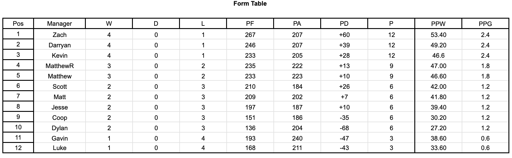 The form table is, of course, the same as the Manager of the Month table this week. So I won't write anything else about it. Here it is though: