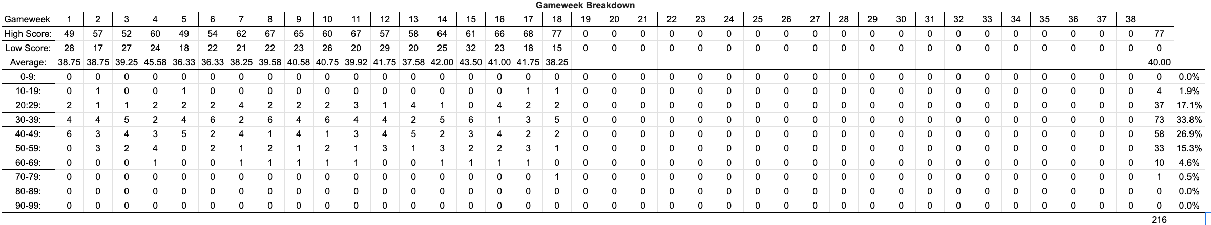 9 - Scott (-1) - League A - Last 5: 25 (L), 56 (W), 59 (W), 28 (L), 42 (L) - Honestly not a bad performance this week, but considering 17 points are from Patrick Dorgu I worry about the coming few as Bruno Fernandes recovers, Amad made the knockouts at afcon, and Eze has vanished into thin air. That said, Neto and Wilson have been solid, Richarlison could have had 2 goals if the offside rule didn't exist, and Everton and Liverpool have a pretty solid run of games (defensively).