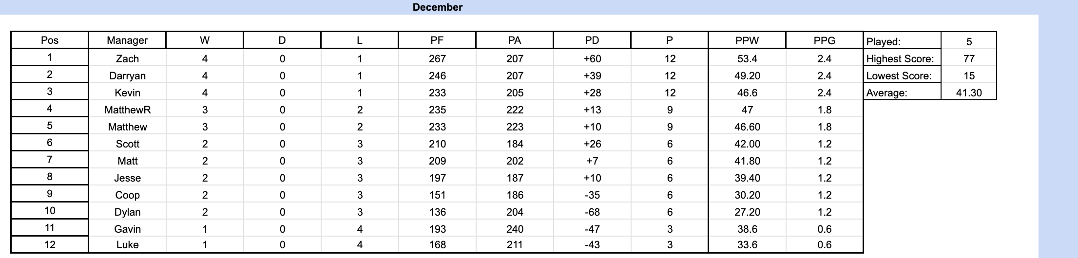 Going into the final gameweek of December, we have a 3 team tie for 1st in the Manager of the Month race! Zach has a slight lead on PF, with Darryan and Kevin barely behind!