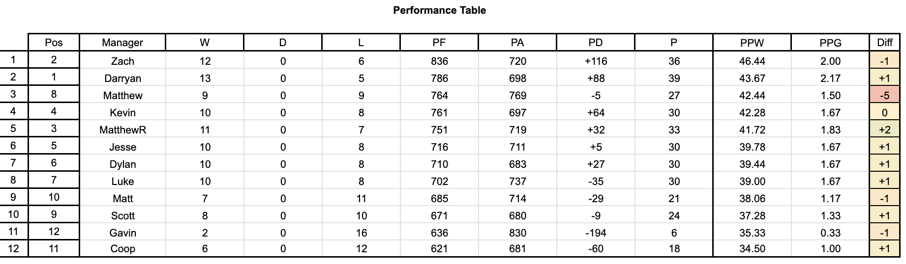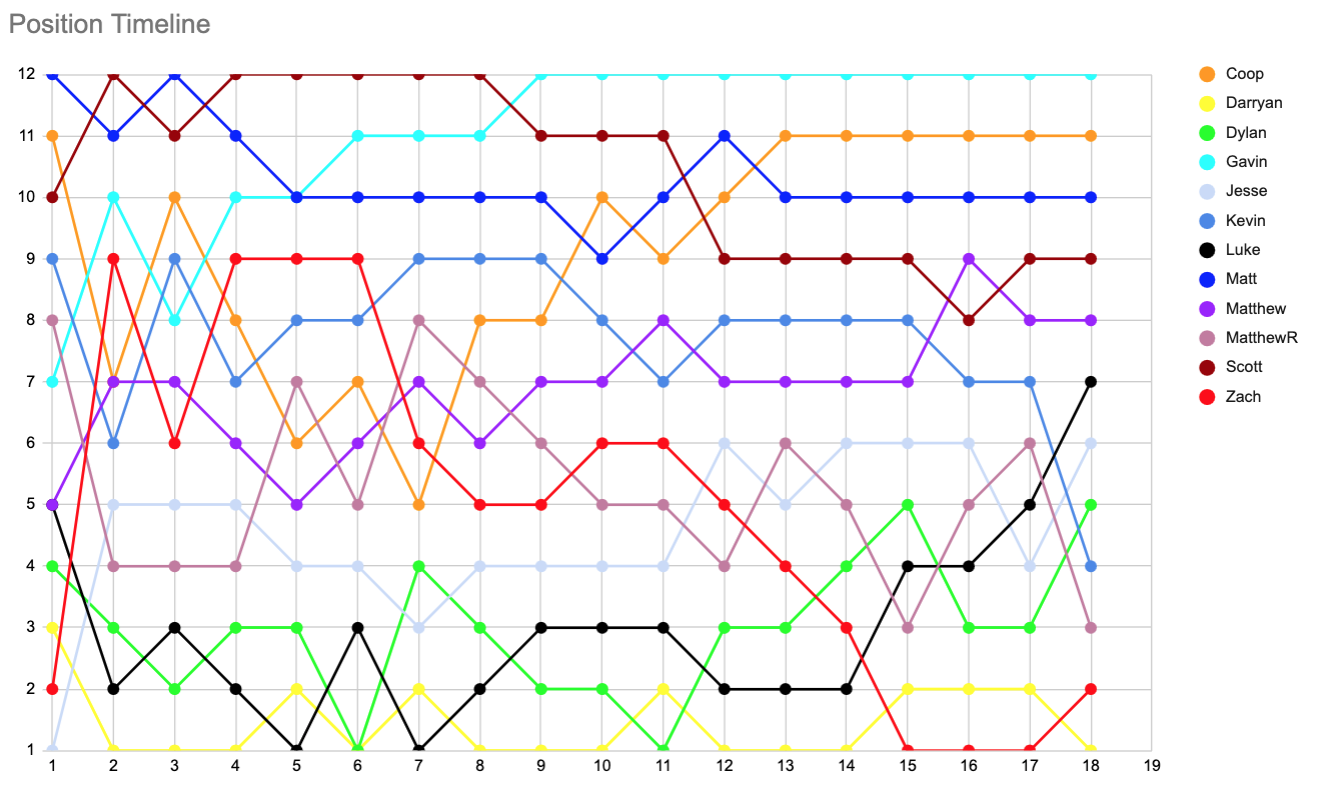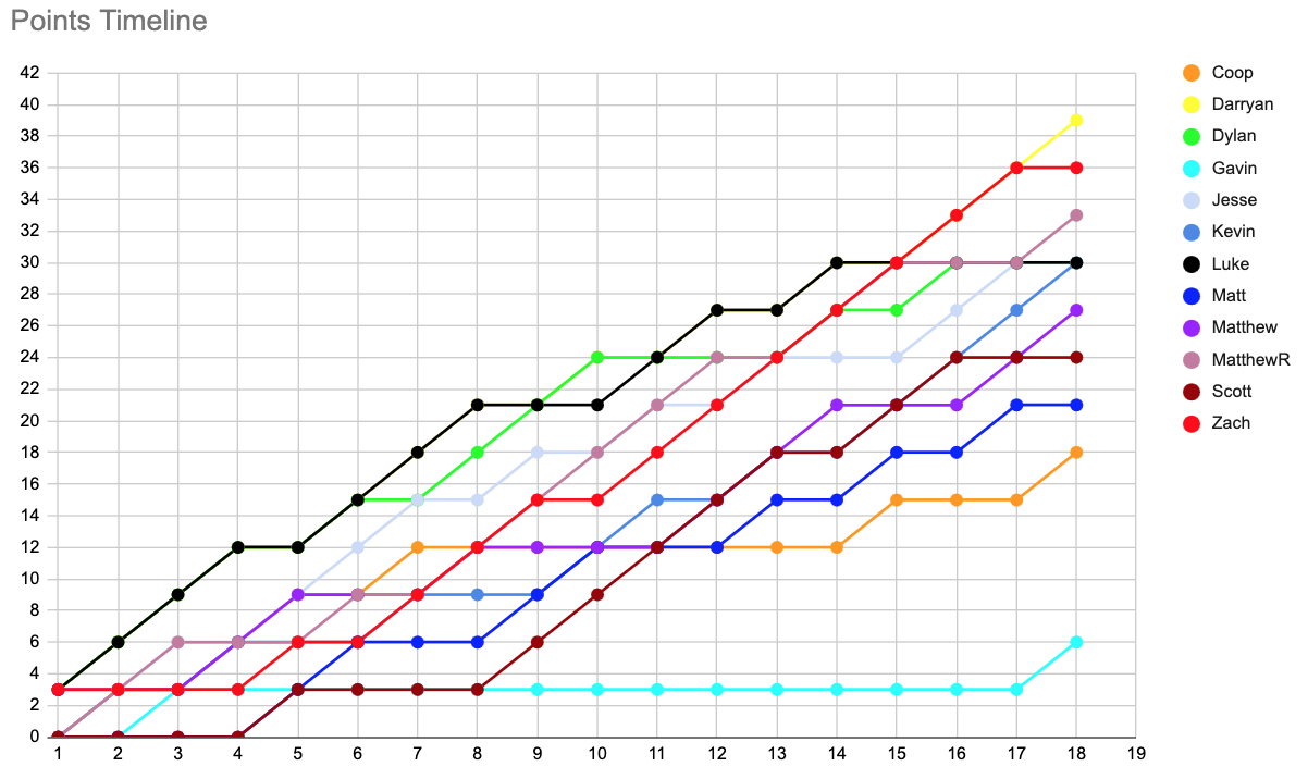 Taking a look at the table, we see an outright leader in 1st for the first time in who knows how long, as Darryan's win takes him 3 points ahead of Zach! Zach keeps himself 3 points ahead of a new face in the top 3: MatthewR, whose head to head win over Zach moved him out of the pack. And that pack on 30 points is big: Kevin, Jesse, Dylan, and Luke all make that list, just 3 points ahead of me. Then, Scott, Matt, and Coop all see 3 point gaps ahead of them.