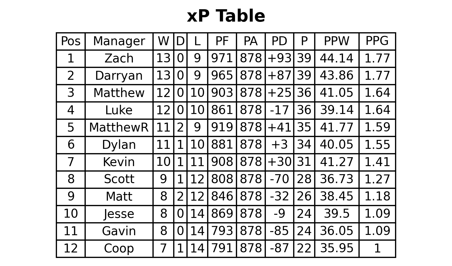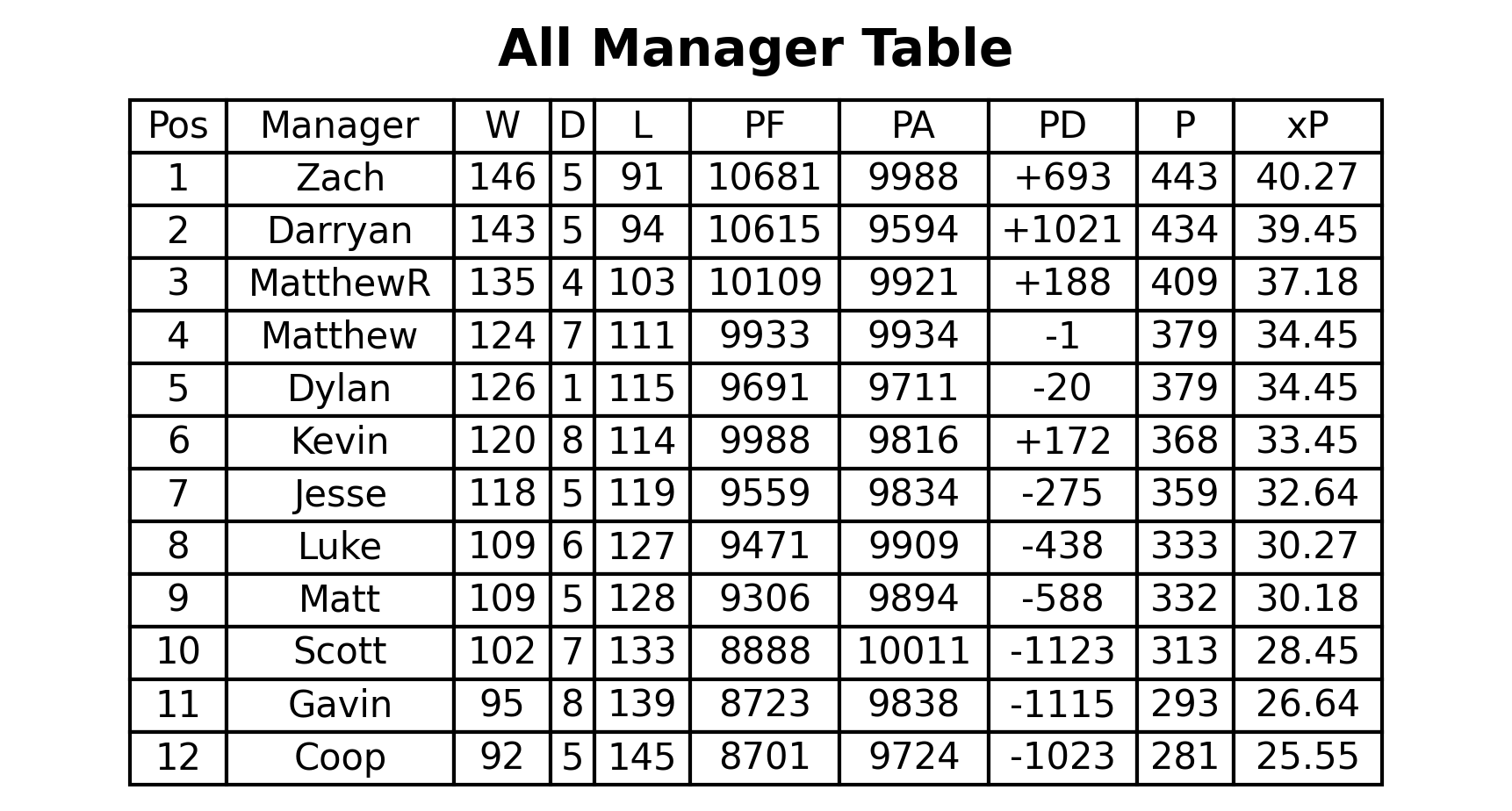 xP Table (manager vs average)