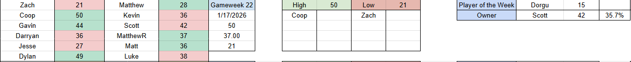 Hello everyone and welcome to gameweek 23! Regular week this week so waivers are due Friday at 3am PST / 6am EST! Highlights this week include a huge upset at the top of the table as MatthewR defeated Darryan 37-36, I beat Zach in a thrilling 28-21 match, and Gavin picked up his 3rd win of the season in a 44-42 win against Scott! Full results are as follows: