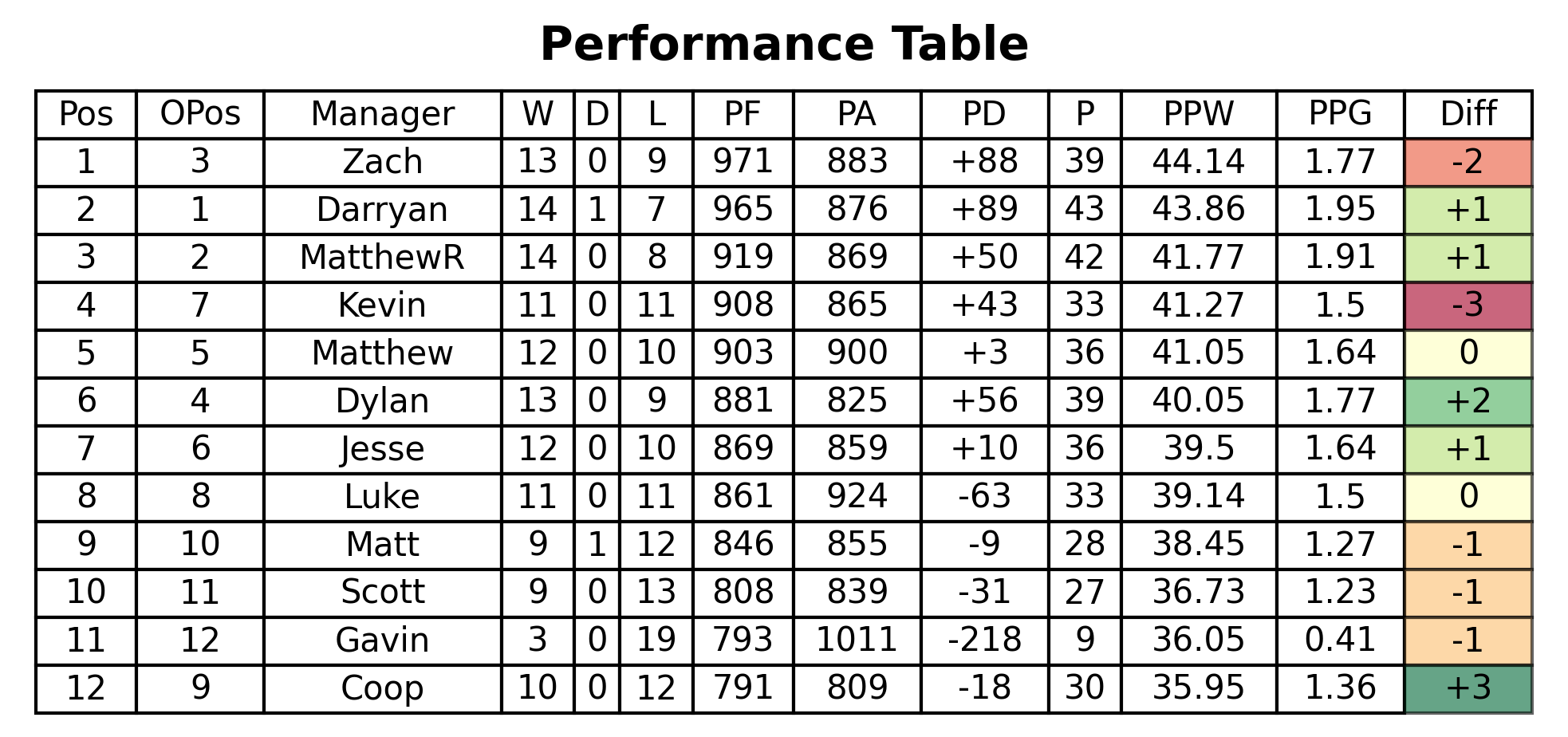 This week will see some great matchups, headlined by a match between two in form teams in Coop vs me! Elsewhere, Darryan looks to bounce back with a match in hand against Kevin, Dylan takes on MatthewR in what could be a key matchup near the top, and Gavin tries to pick up back to back wins against Zach. Full matchups are as follows: