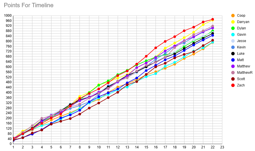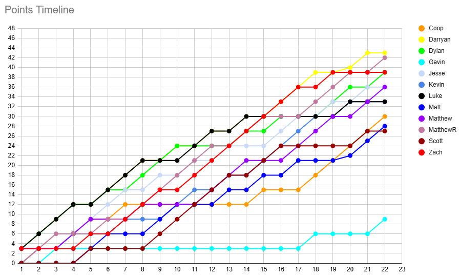 Lots of movement this week across the table, where Darryan's lead at the top is cut to just 1 point over MatthewR. He overtakes Zach with his win, with the latter now tied on points with Dylan. I now sit 3 points behind the duo, ahead of Jesse on PF. Kevin and Luke remain in their places 3 points back, now just 3 ahead of Coop. Matt follows him by 2, hopping over Scott by a single point. Gavin picks up the pace, now just 6 games off Scott.