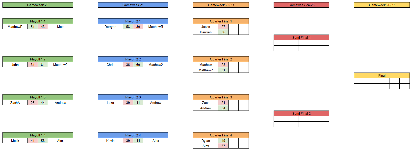 Welcome to gameweek 4 of the knockout rounds of The League (tm) and our second leg of the quarter final round! A lot of very close matchups across the board and some interesting results as well! All eyes are of course on the Matthew vs Matthew2 match where I defeated myself in the first leg 31-28! Which version of me will win the second leg?? Elsewhere, Andrew took a big lead over Zach by 13 points, Dylan took a similar one against Alex by 12, and Darryan won his first leg against Jesse by 9! All definitely within the realm of possibility for comebacks, so this week should be very interesting! Full results of the first leg are as follows: