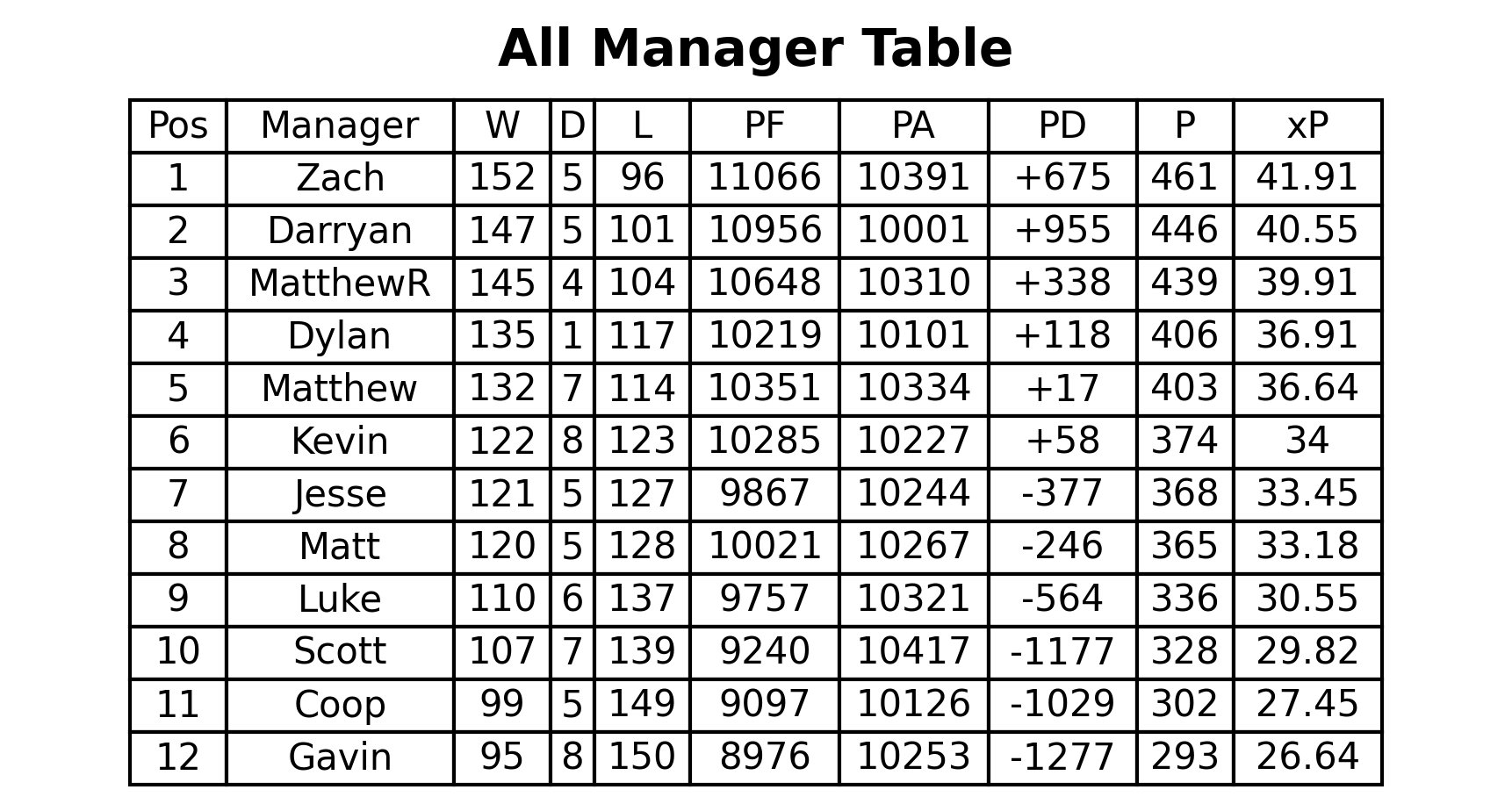 2 - Darryan (-1) - League A - Last 5: 42 (L), 43 (D), 58 (W), 36 (L), 31 (W) - You gotta imagine leaving Evanilson on the bench with an 8 pointer was intentional, right? At this point it must be to boost his numbers on Alex's spreadsheet, because that's the 16th instance of a player with 5+ points sitting the bench for him this season. But hey, a win's a win and if you don't need the PF who cares if it's on the bench. Anyway, Arsenal players are flagged (nothing new), and Haaland is finally getting some rest, so I'm sure we'll see a hat trick any day now. Good luck to the unfortunate soul that goes against rested Erling.