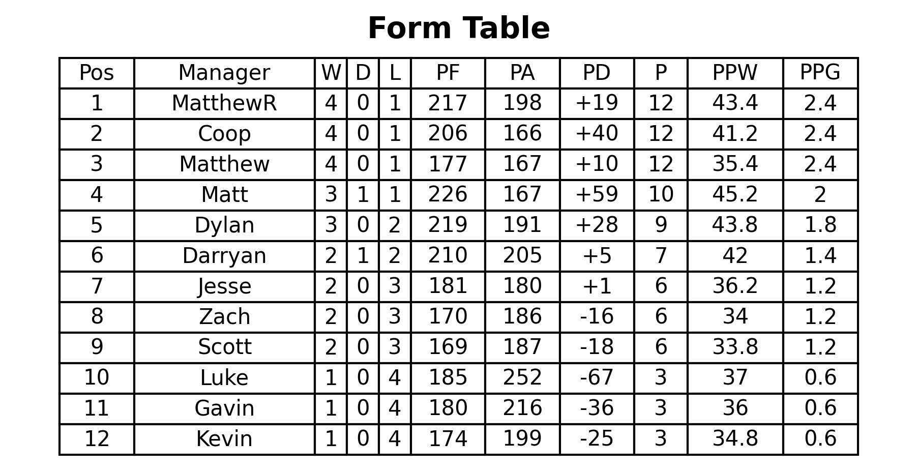 In terms of form, MatthewR takes the top spot on PF as he, myself, and Coop all sit on 12/15 points earned over the last 5 weeks!