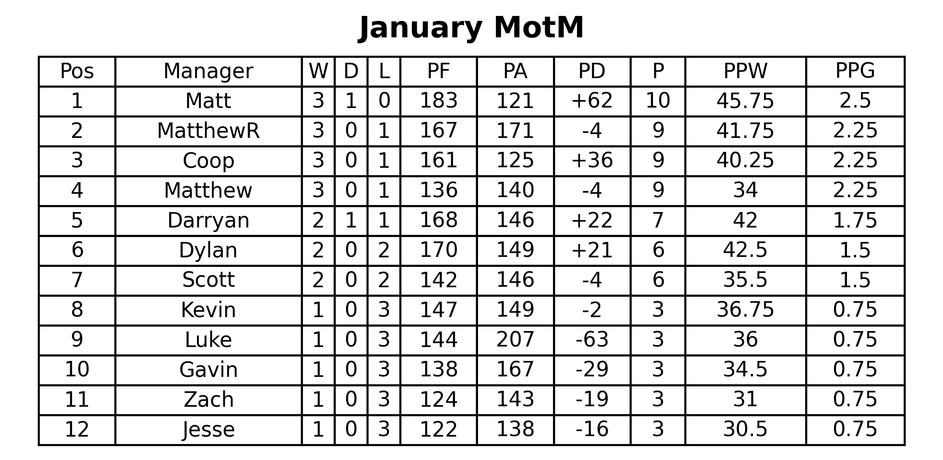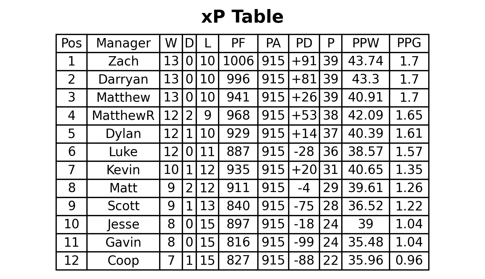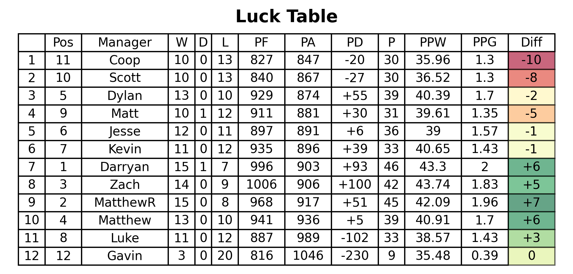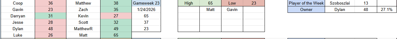 This week will see some great matchups, headlined by what should be a very interesting match between two in-form teams in Matt vs Dylan! Elsewhere, Zach looks to undo some recent bad form with a match against Coop, I face off against Luke, and will Gavin get his 4th win of the season against Kevin? Full matchups are as follows: