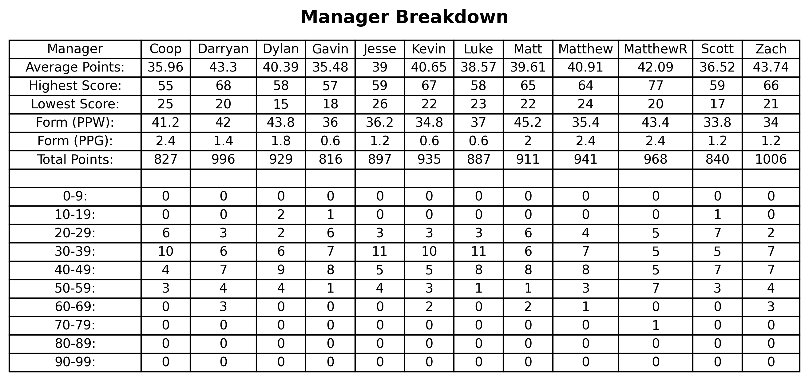 8 - Kevin (-2) - League A - Last 5: 27 (L), 45 (W), 39 (L), 36 (L), 27 (L) - Another rough week for Kevin as he experiences a lot of 1s and 2s across the board. Hope is not completely lost though, with Gibbs-White having a pretty solid past few weeks, Joao Pedro doing as expected and scoring in back to back games, and KDH getting some minutes finally. That said, Keane looks unlikely to be starting as long as Branthwaite is healthy, Kerkez was subbed early for Robertson, and Thiaw seems to be oscillating between hauling and doing nothing.