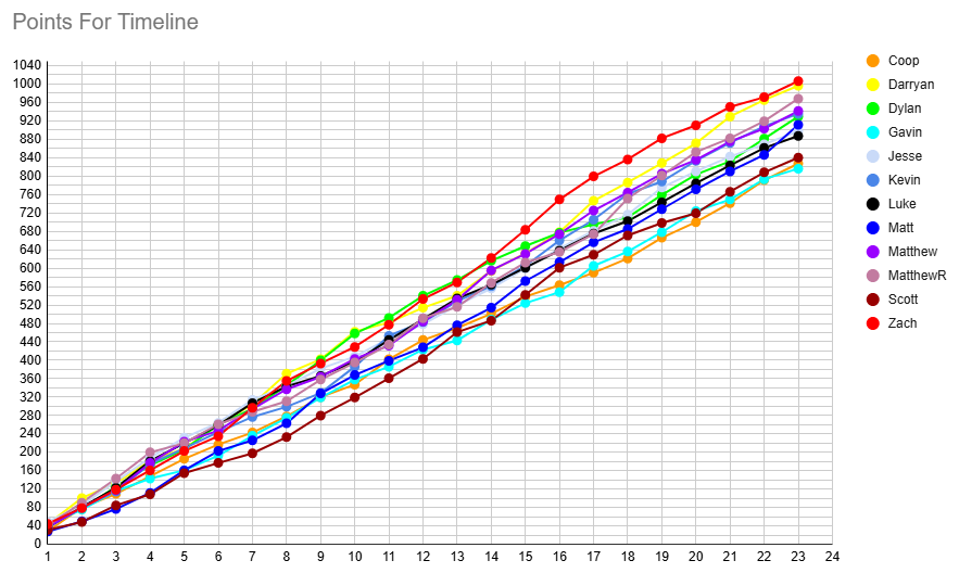 - Zach (3) vs Coop (11) (all-time: 2-0-2, 161-165)