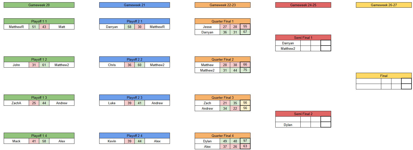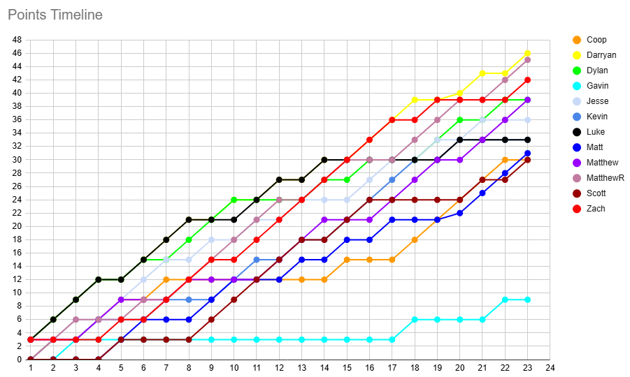 Hello everyone and welcome to gameweek 24! Another normal week with waivers due at 5:30am PST / 8:30am EST! Some very close matches this week, headlined by MatthewR's crazy 49-48 win over Dylan! Elsewhere, Darryan picked up a fine margin win against Kevin 31-27, I fended off Coop by a narrow margin of 2 points, 38-36, and Scott upset Jesse in a close 32-28 match! Full results are as follows: