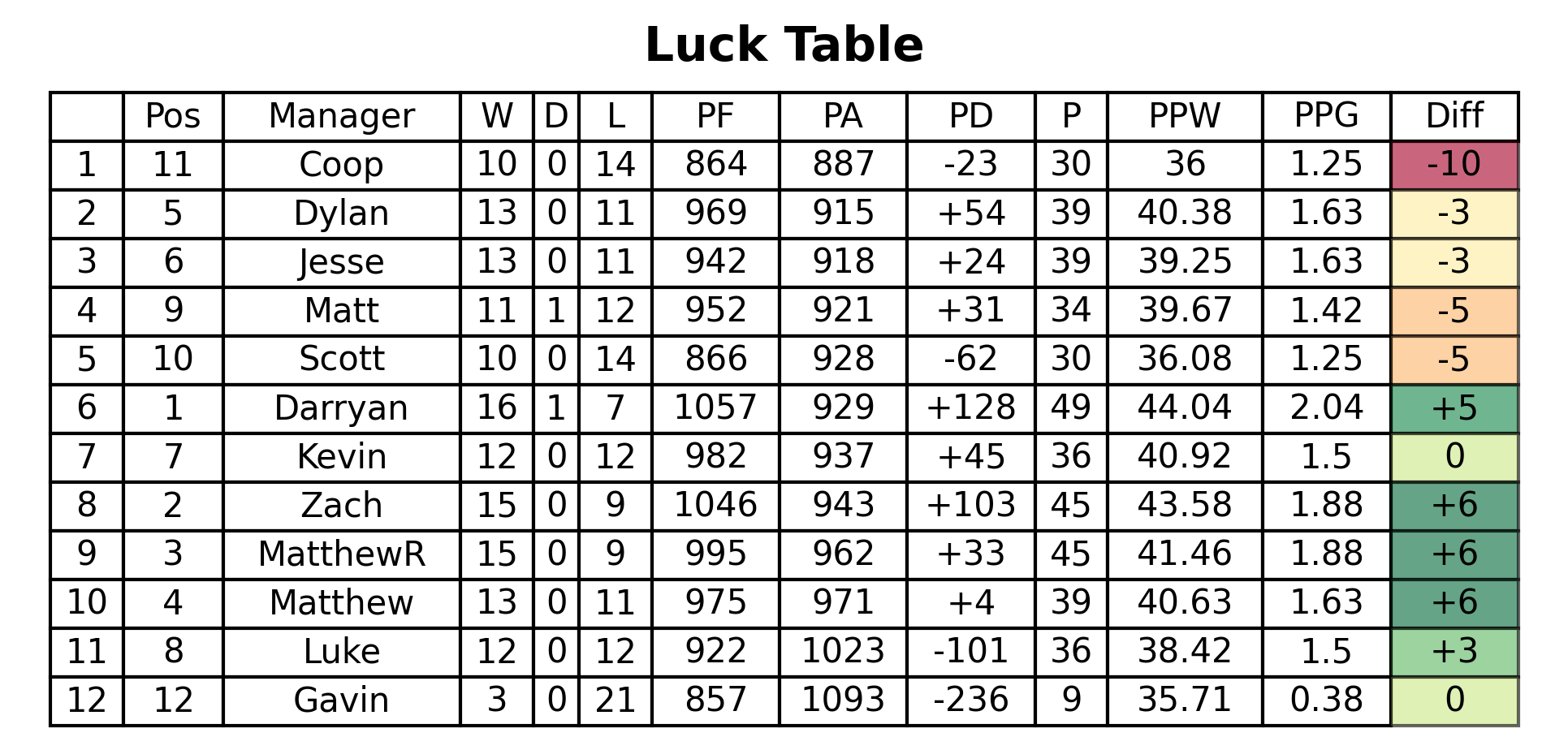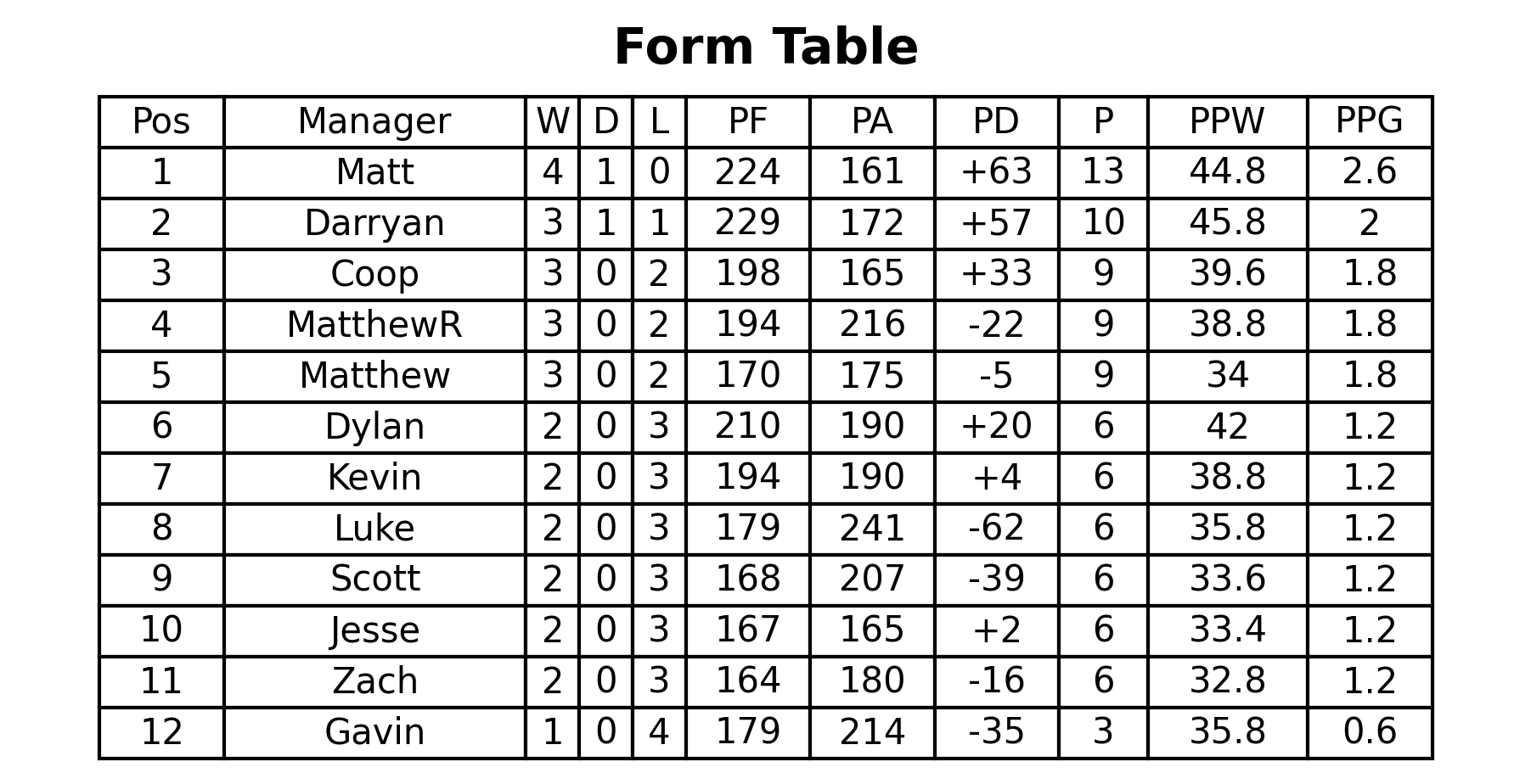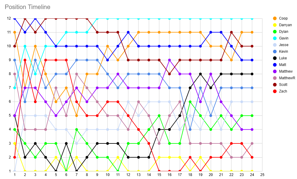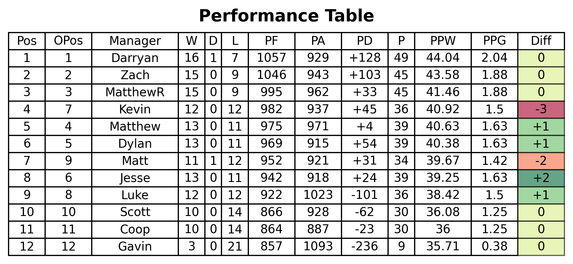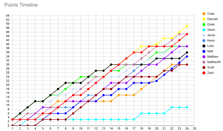 Over on the league table, Darryan's win sees him extend his lead at the top to 4 points over Zach, who went above MatthewR on PF this week! Matthew sits 6 points above me, Dylan, and Jesse, who are just one win ahead on Kevin and Luke in this congested midtable. Matt keeps pace just 2 points behind, extending his gap over Scott and Coop to 4 points.