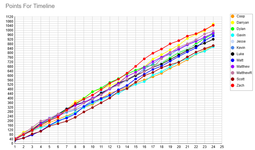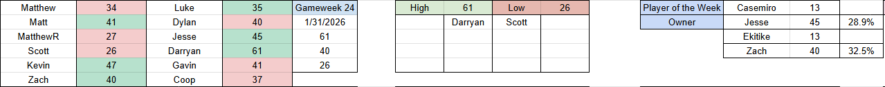 Hello everyone and welcome to gameweek 25! Waivers this week were due this morning at 10:30am PST / 1:30pm EST so free agency is open! Another week of close matches, headlined by Matt's narrow 41-40 win over Dylan! Elsewhere, Luke defeated me by the same margin at 35-34, and Zach beat Coop in a close 40-37 match, and Kevin took home all 3 points in a high scoring matchup against Gavin, 47-41! Full results are as follows: