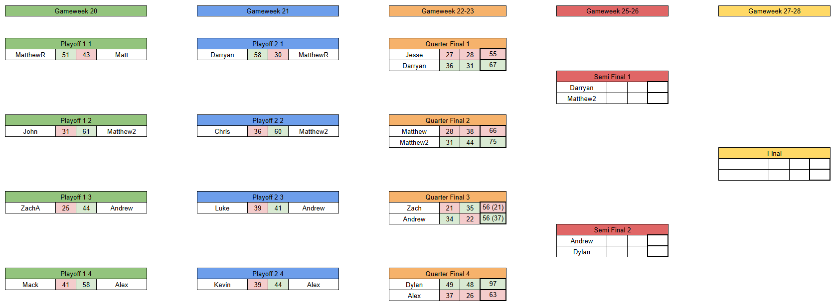 Welcome to gameweek 6 of the knockout rounds of The League (tm)! After a brief side quest, we now have our semi final matchups! The first match will be between Darryan and Matthew2, and the winner will play against either Andrew or Dylan in the final!
