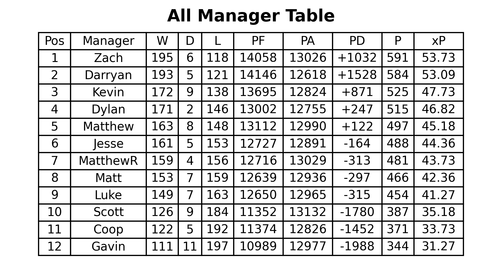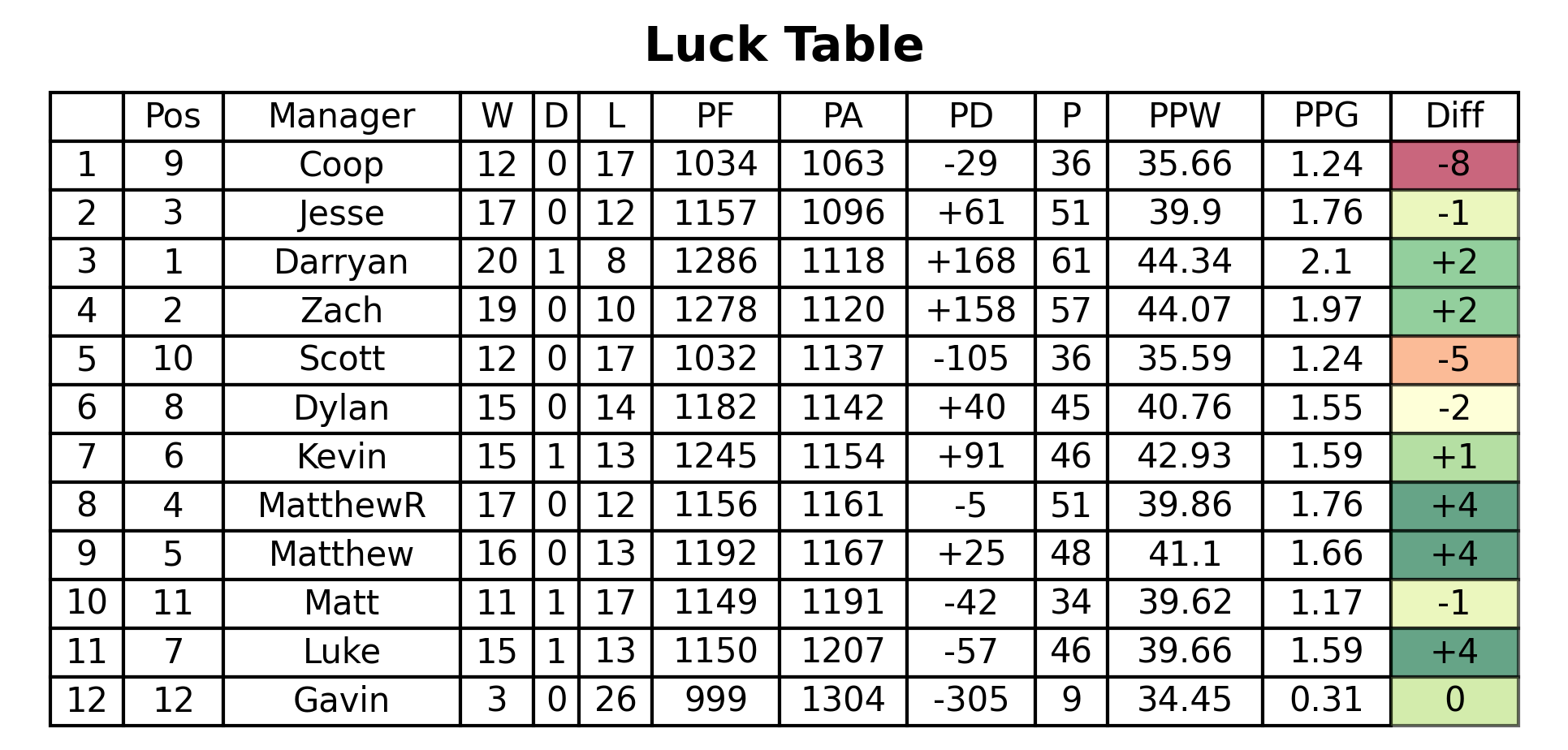 This week will see some great matchups, headlined by what could be a huge matchup in the race for 3rd between Kevin and MatthewR! Elsewhere, two in-form teams go against one another as Darryan takes on Jesse, and Coop and Luke face off! Full matchups are as follows:
