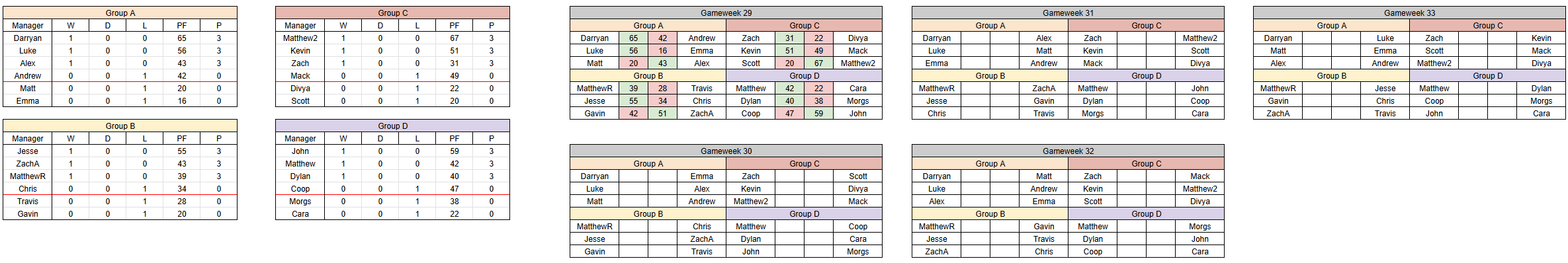 Welcome to Gameweek 2 of the Champions Cup! Some great results across the groups this week, headlined by a thriller between Kevin and Mack in Group C where Kevin prevailed 51-49! Dylan pulled off a similar result over in Group D as he defeated Morgs by a score of 40-38, and in the same group John picked up a big 3 points with his 59-47 win against Coop! The other notable matchup this week came from Group B, as Gavin's misery evidently continues outside of League A, as his 42 pointer was rebuked by ZachA's 51 points. The full results are as follows: