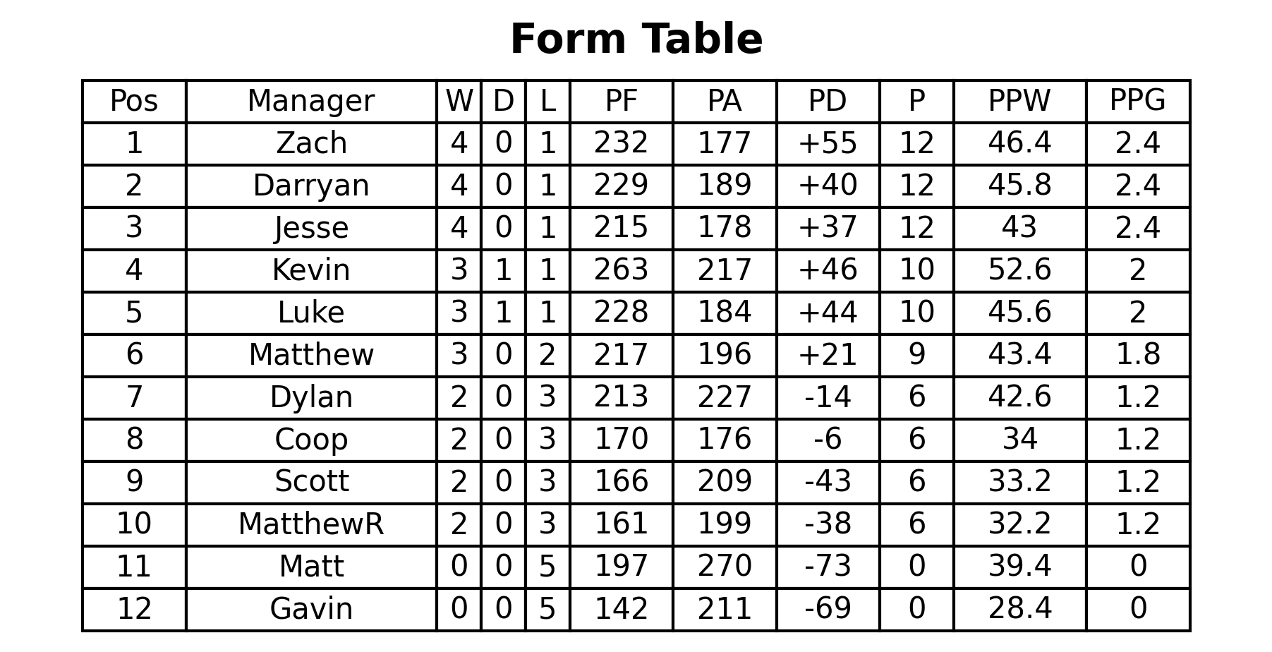 And taking a look at the form table, Zach narrowly takes the top spot on PF above Darryan and Jesse, with all 3 having earned 12/15 available points!