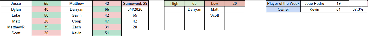 Hello everyone and welcome to gameweek 30! Waivers this week are due Friday at 6:30am PDT / 9:30am EDT! Some high scoring matchups this week, led by Jesse's 55-42 victory over me. Elsewhere, MatthewR picked up an upset win over Zach 39-31, Luke piled onto Gavin's misery by beating him 56-42, and Darryan's week high 65 pointer defeated Dylan's 40 points. Full results are as follows: