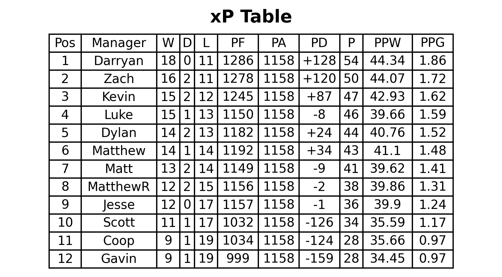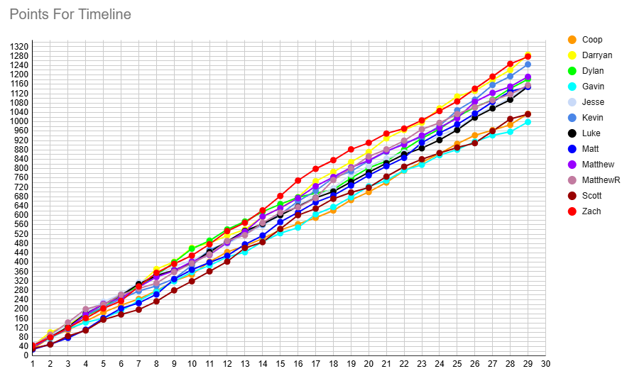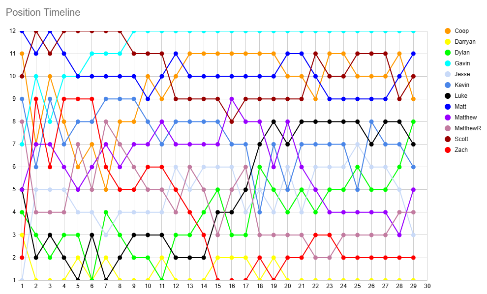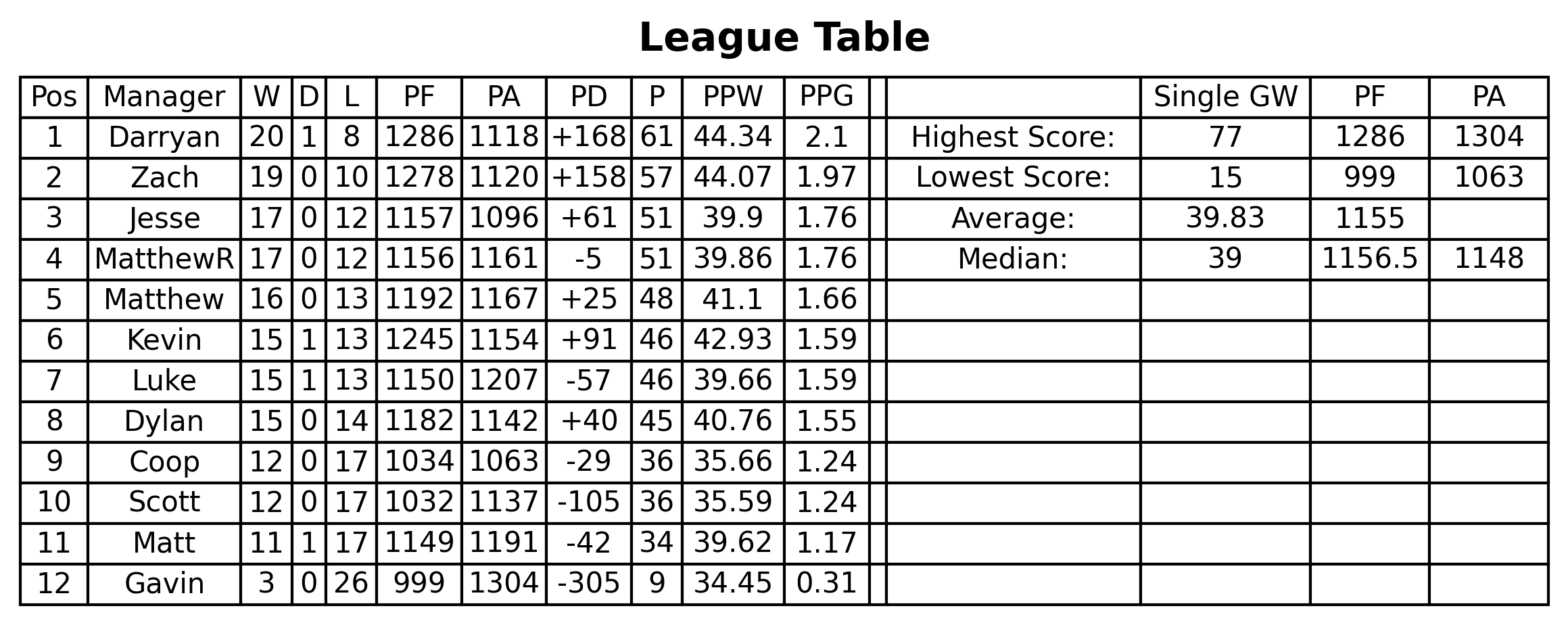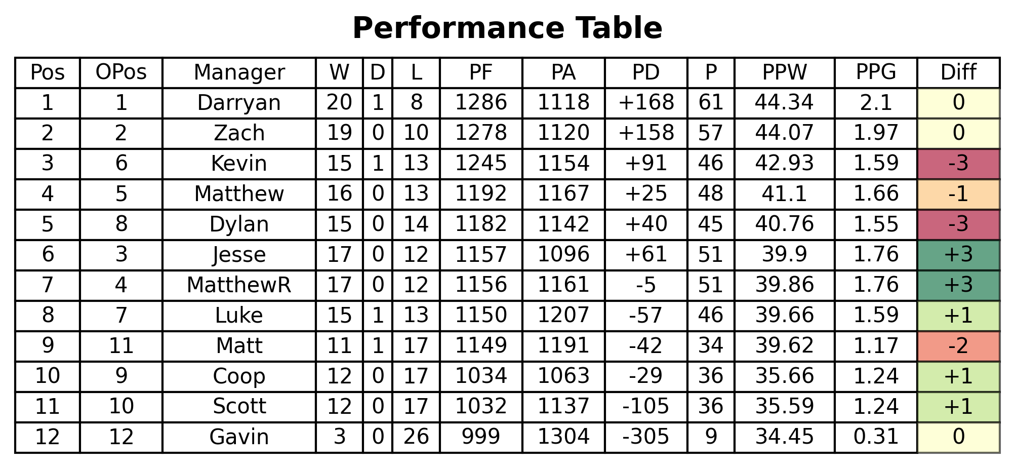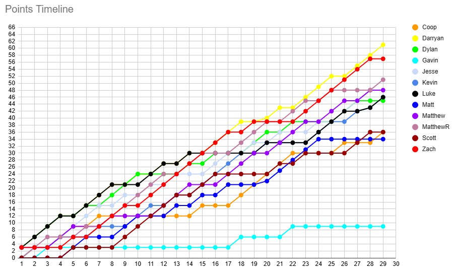 Once again seeing a lot of movement across the league table, as Darryan's lead at the top over Zach increases to 4 points. Zach's lead over 3rd (which is now occupied by Jesse on PF) drops to just 6 points, as Jesse and MatthewR move to 3 points ahead of me. Kevin and Luke see movement up the table to just 2 points behind, leapfrogging Dylan by a single point with their wins. Further down, Coop moves up to 9th with his win, equal on points with Scott and 2 ahead of Matt.
