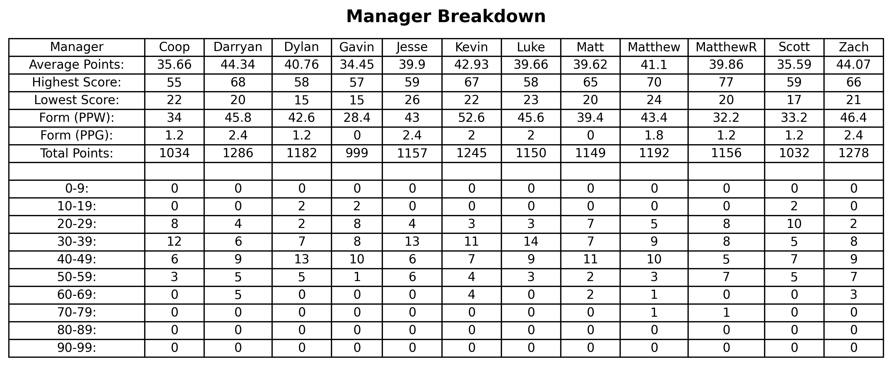 10 - Chris (-1) - League B - Last 5: 36 (L), 42 (L), 38 (W), 43 (L), 34 (L) - 1 win in the last 6 for Chris doesn't look great, but he's still scoring pretty decently on average even with a -3 from Van de Ven and -1 from Matty Cash this week. We'll see if he can recover though, with Saliba being in and out of the team, his talisman version of Wilson being injured, and a lot of his team relying on defcon points, he may need some of his players to lock in during the run in if he wants to close the gap on the promotion spots.