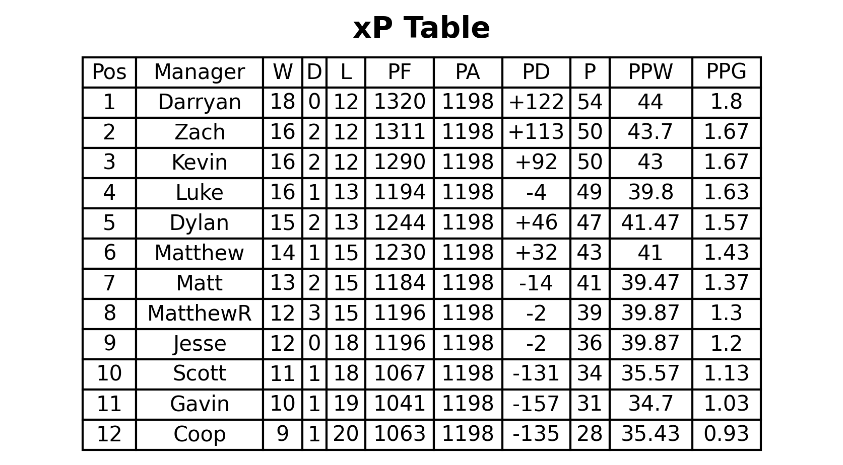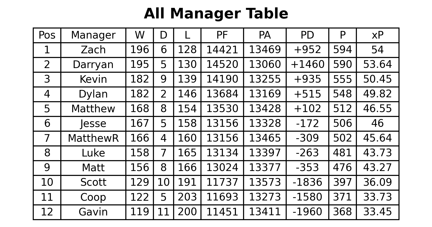 xP Table (manager vs average)