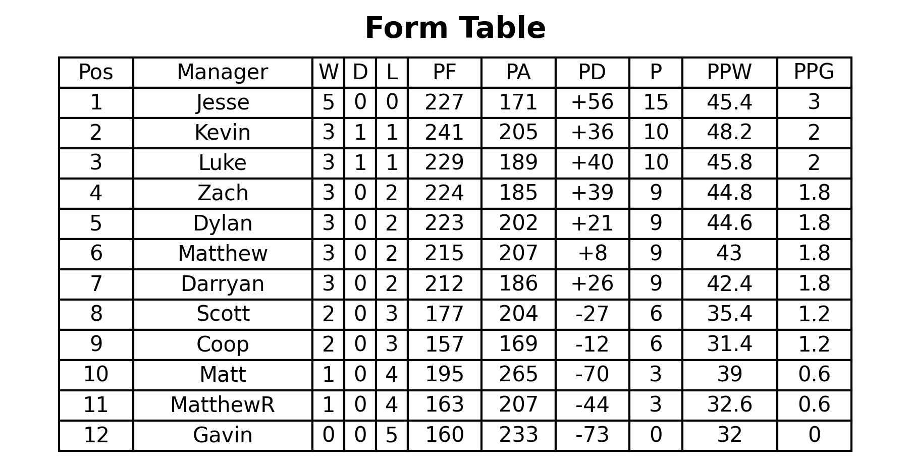 And over on the form table, Jesse takes the top spot with a perfect 15/15 points earned! He sits just ahead of Kevin and Luke, who have 10/15 in the last 5!