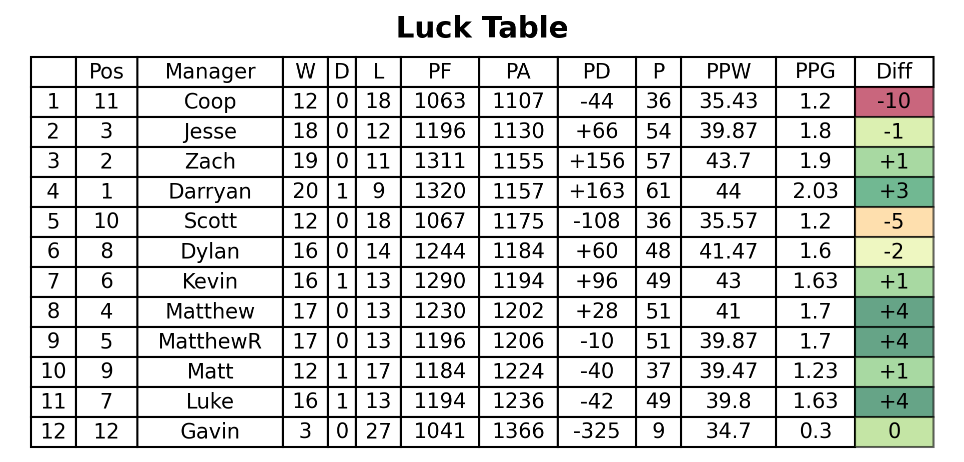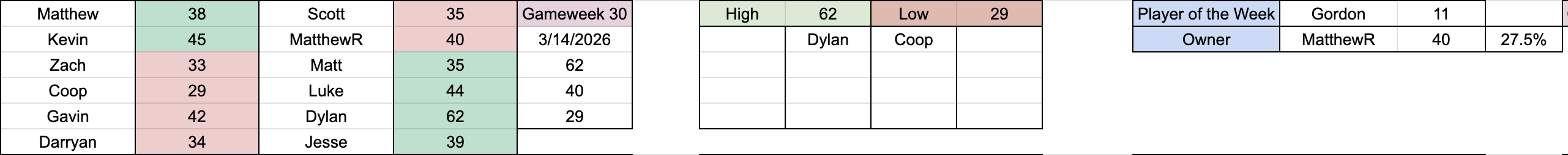 This week will see some great matchups, headlined by a matchup between two in-form teams in Luke vs Jesse! Elsewhere, Dylan and I face off, Scott takes on Coop, and Kevin looks to pull off the upset against Zach! Full matchups are as follows: