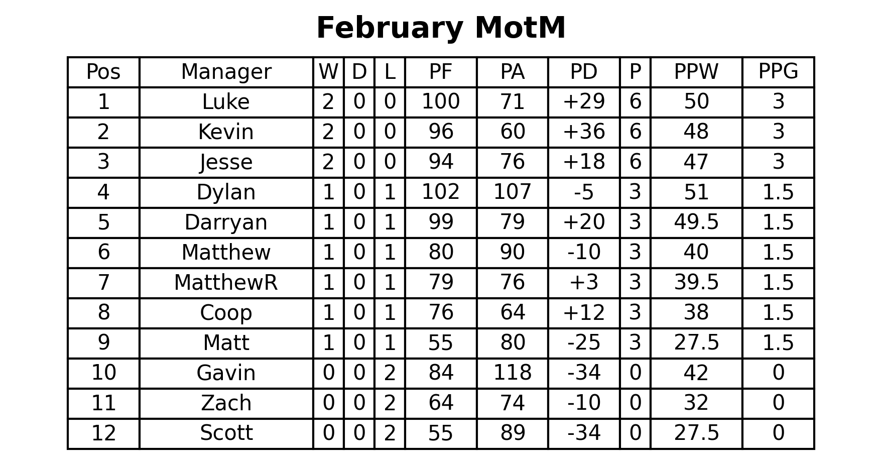 Jesse (of course) sees his win this week take him top of the table on PF over League A compatriot MatthewR at 6 points, ahead of ZachA and Gavin. The latter of whom earning his first win this week in who even knows how long. The two winless managers in this group are Chris and Travis.