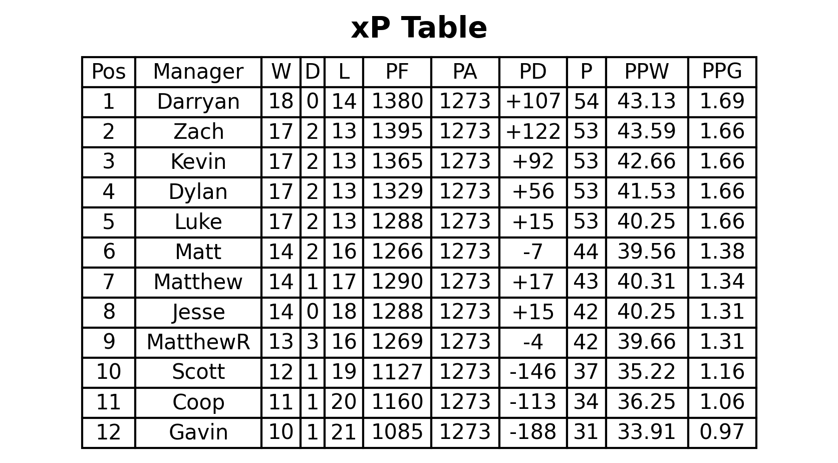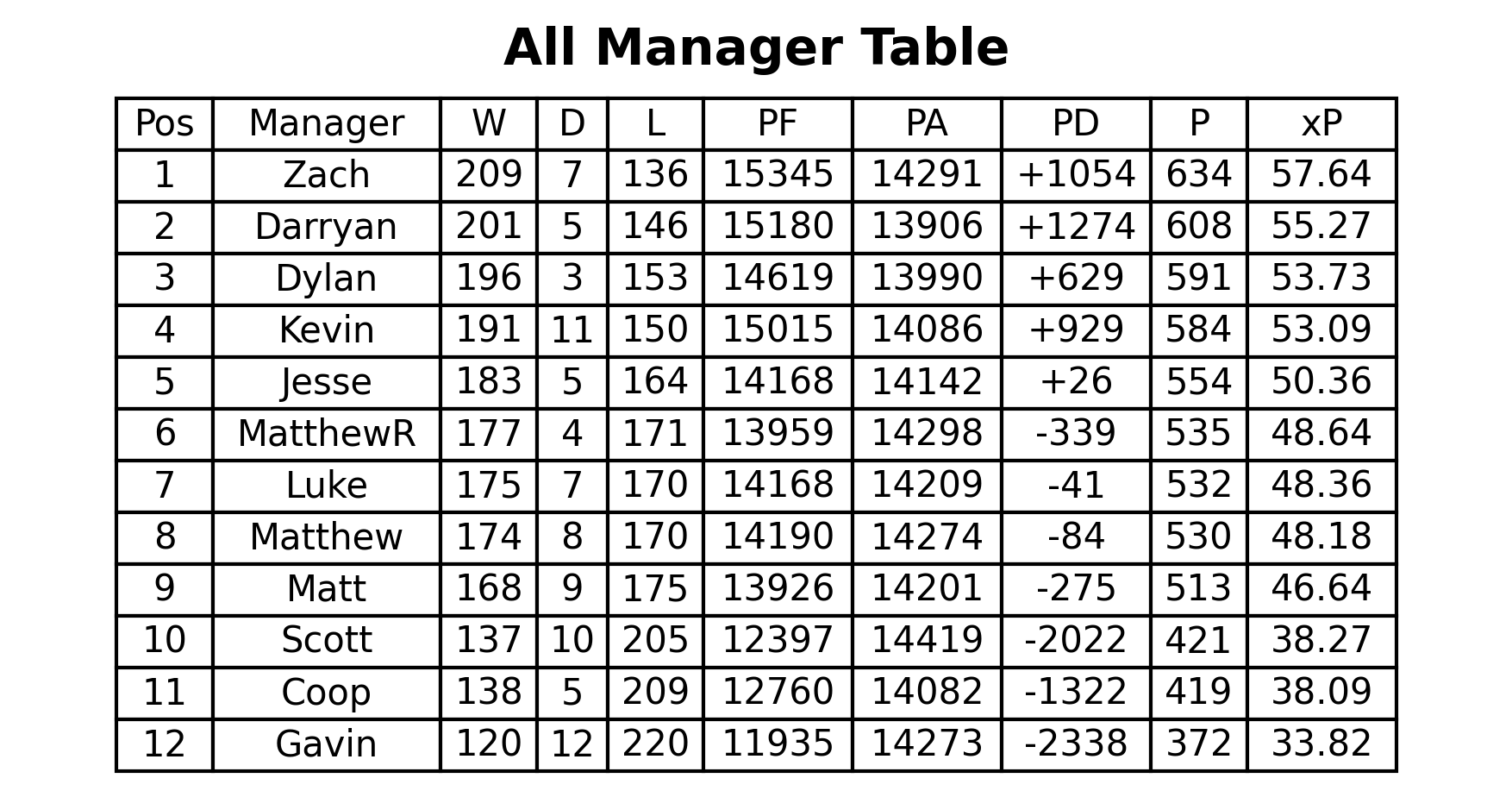 xP Table (manager vs average)