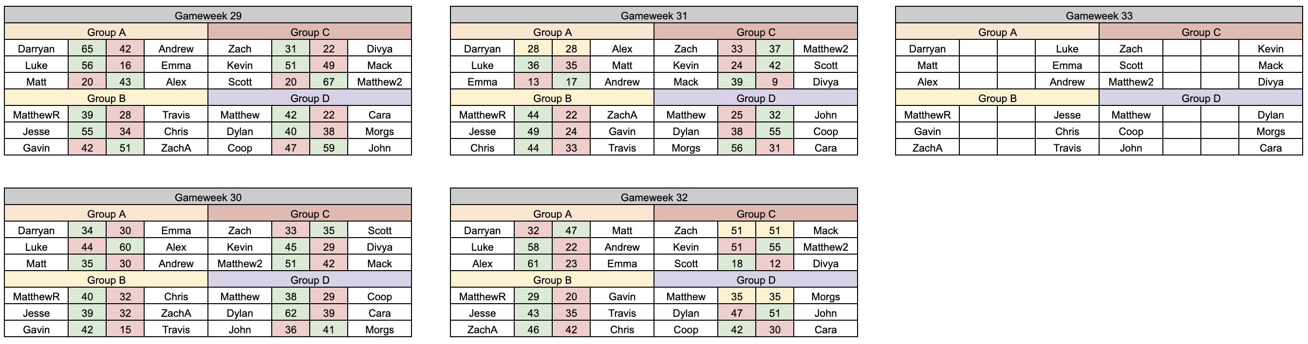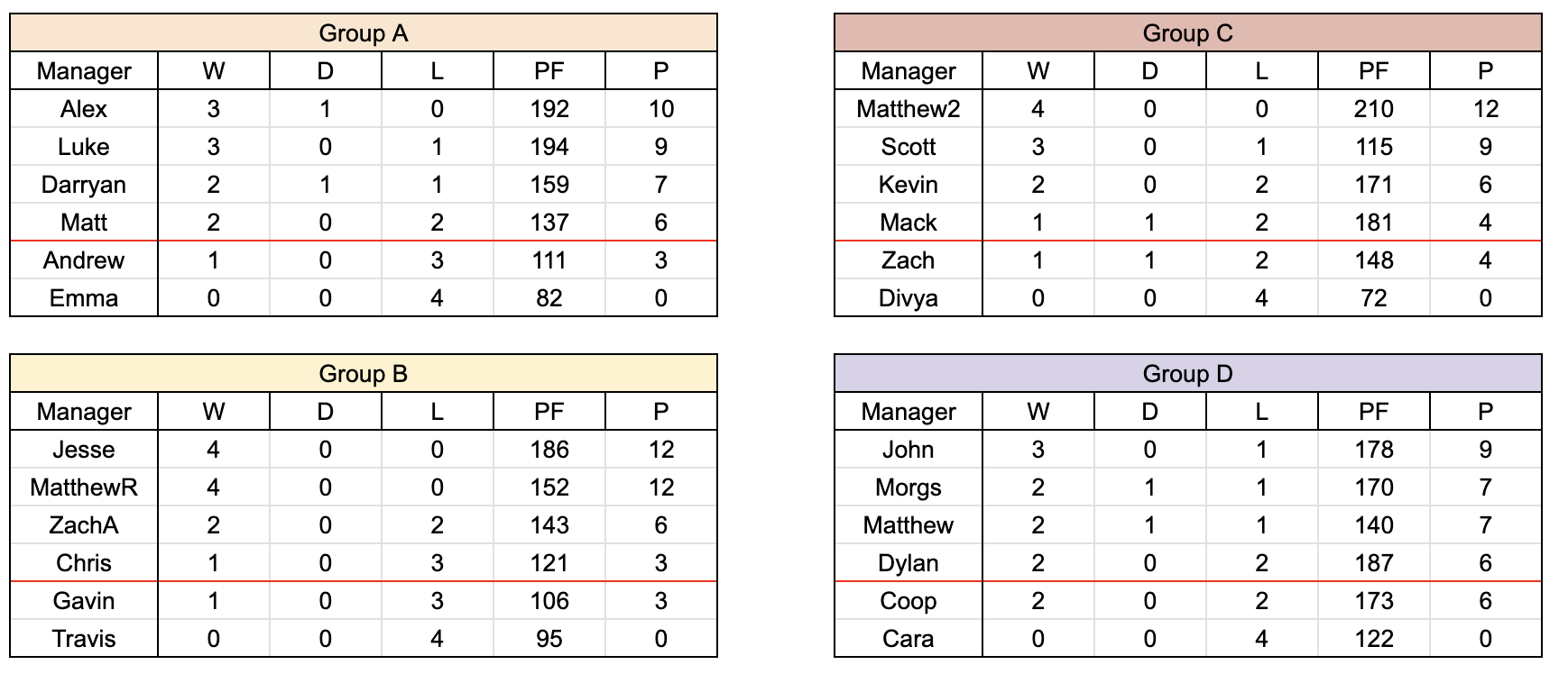 Following this week's results Alex takes a single point lead of Group A ahead of Luke, with Darryan trailing just a couple points behind. Only Matt has a risk of not qualifying, but Andrew will need to win and overcome a 26 PF gap. This week will see the following matchups: