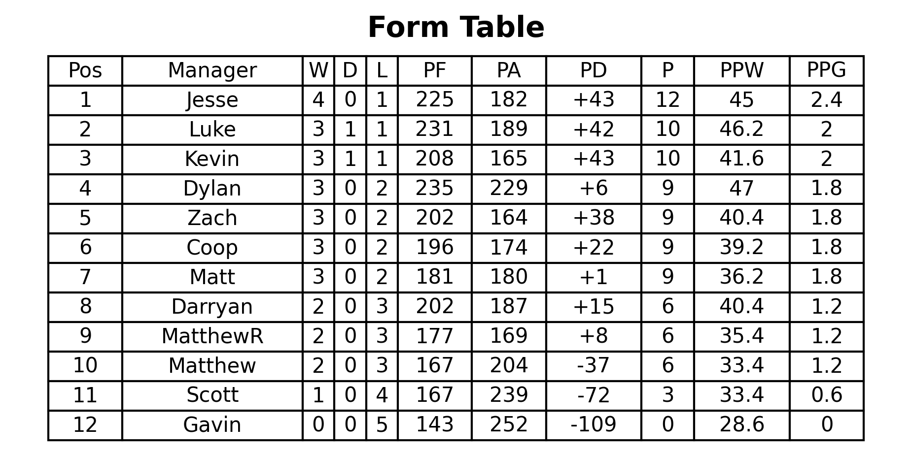 Over on the form table, Jesse retains his spot at the top with 12/15 points earned! Luke and Kevin keep pace with 10 points from the last 5 weeks!