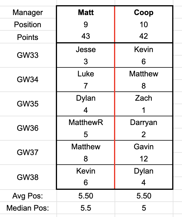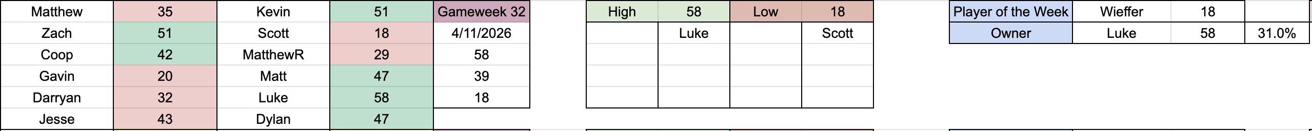 Hello everyone and welcome to double gameweek 33! Waivers this week are due Friday at 3:00am PDT / 6:00am EDT! Some interesting results and big upsets this week, led by Luke's huge 58-32 win against Darryan! Elsewhere, Coop picked up his own upset over MatthewR 42-29, Dylan took a close match against Jesse 47-43, and Kevin beat me 51-35. Full results are as follows: