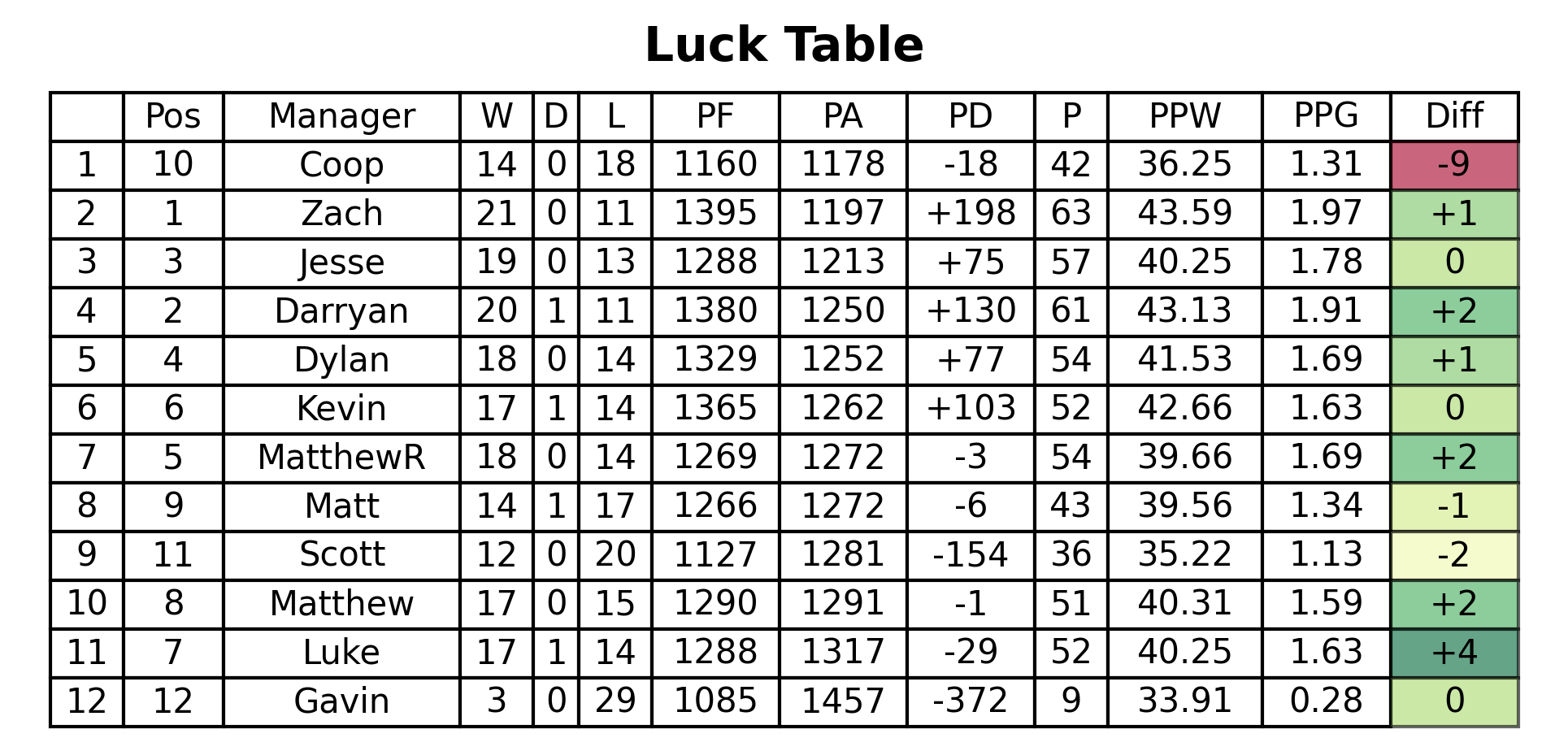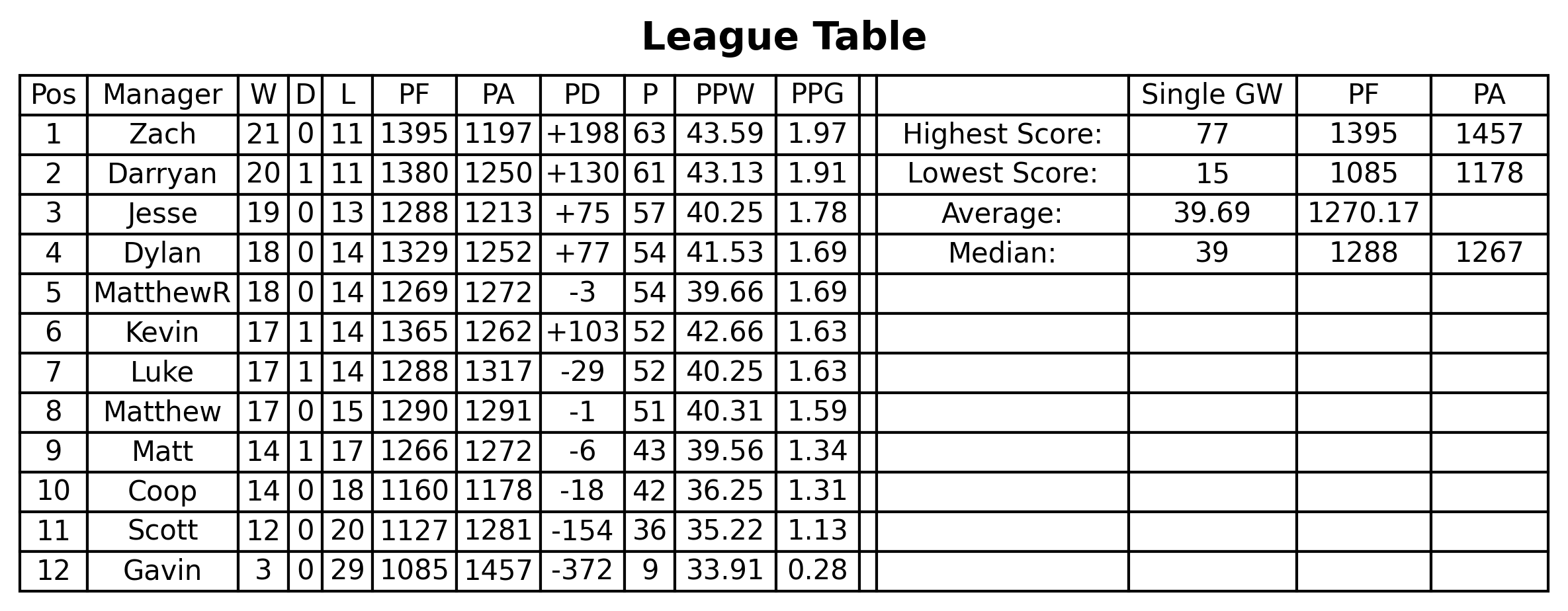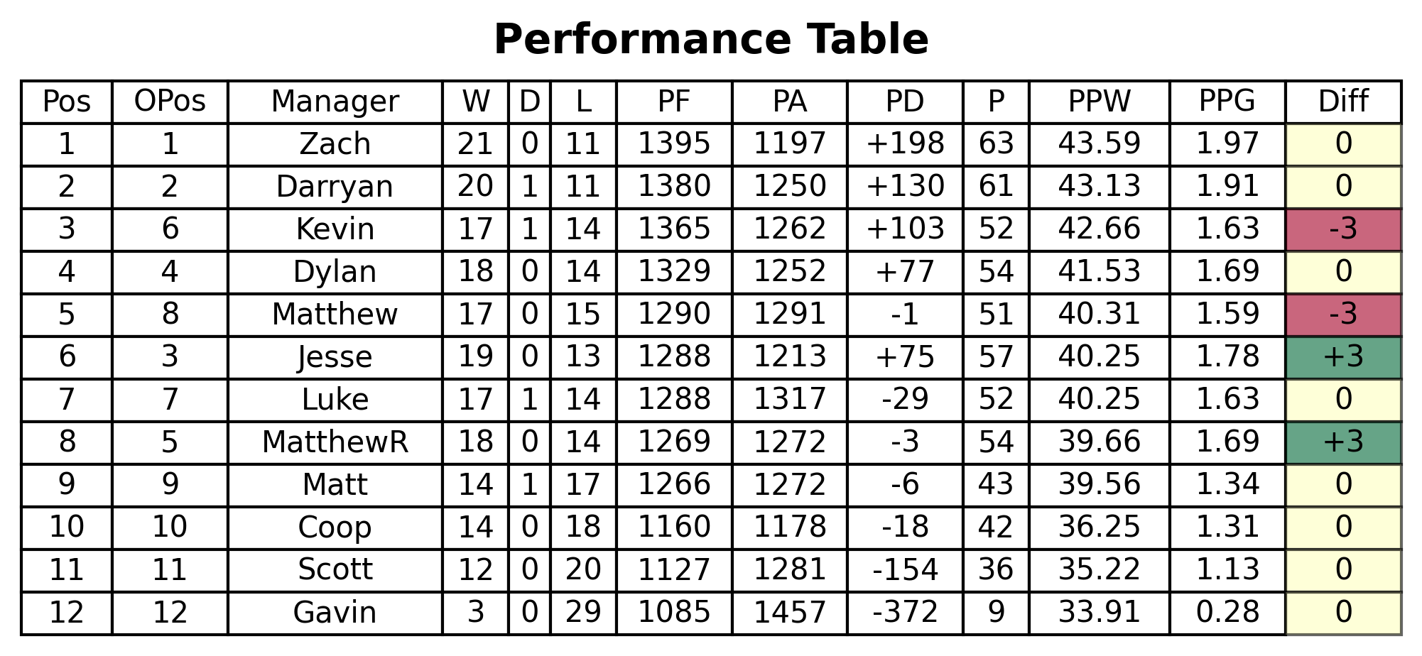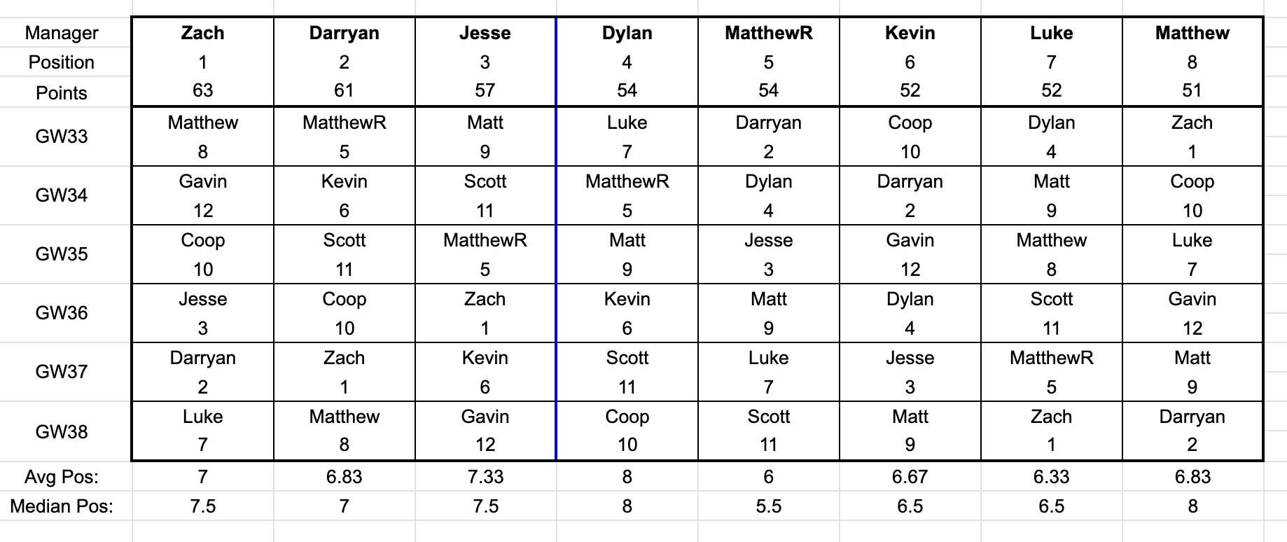 With 6 weeks to go, the table looks as close as ever. With Darryan's loss, Zach takes the top spot by 2 points. Darryan now sits just 4 ahead of Jesse in 3rd, who is 3 points ahead of Dylan and MatthewR, who are 2 points ahead of Kevin and Luke, with that duo just a single point ahead of me. Then between 8th and 9th there's a bit of a gap of 8 points, where Matt and Coop have made some space above the automatic-relegation spots.