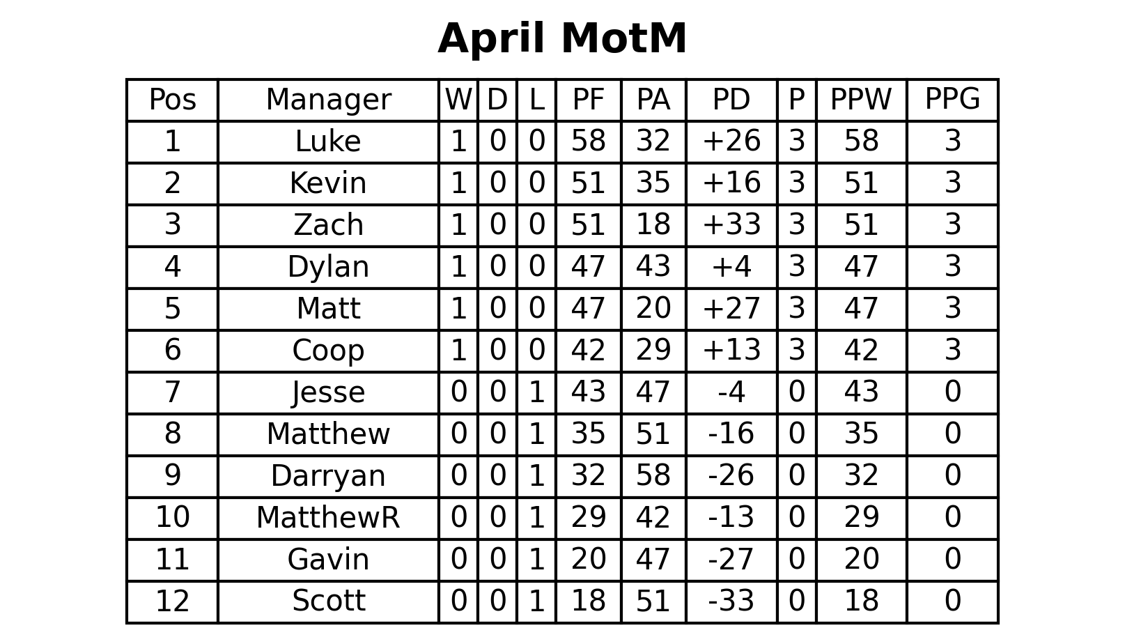 One week into April and Luke takes the top spot with 58 PF! Kevin and Zach both also sit at 50+ PF.